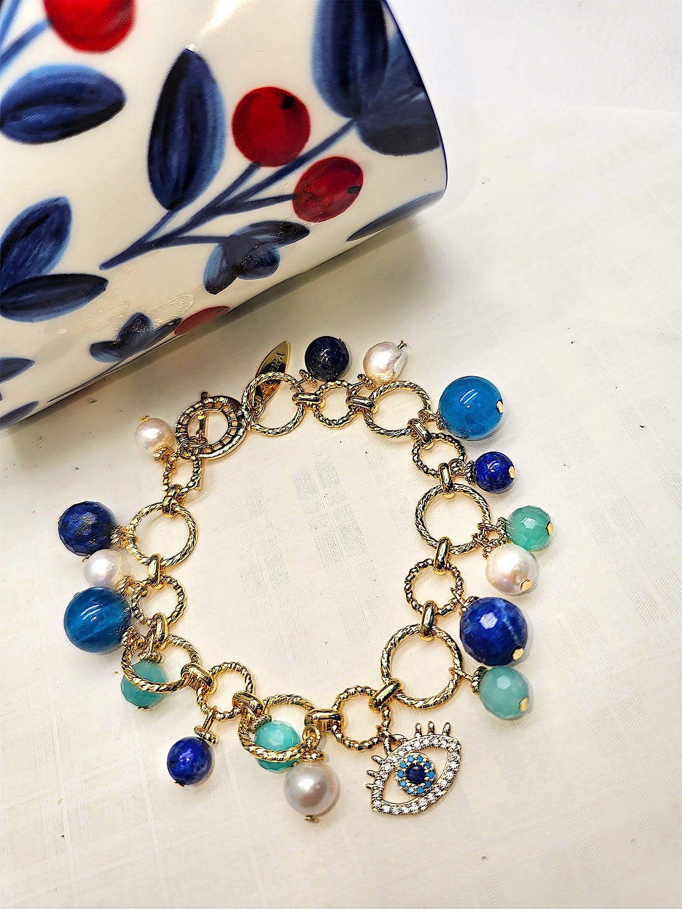 This eye-catching charm bracelet is crafted with a gold-tone textured link chain adorned with dangling Lapis Lazuli, Blue Agate, and Amazonite beads alongside lustrous Freshwater Pearls, all anchored by a sparkling crystal-encrusted Evil Eye pendant. The combination of these gemstones is thought to offer powerful protection and tranquility, with Lapis Lazuli enhancing wisdom, Amazonite soothing the spirit, and the Evil Eye warding off negativity.