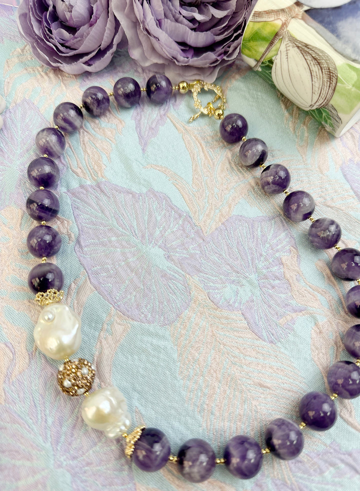 This Amethyst With Baroque Pearl Statement Necklace KN046 is perfect for setting off any outfit! With its timeless and classic design featuring amethyst trimmed with baroque pearls and rhinestones bordered pearls strung onto chic choker, you'll look effortlessly beautiful for any occasion. Dare to shine! This is also a very nice gift for birthday or anniversaries which will be contained in a nice jewelry box with well packed.