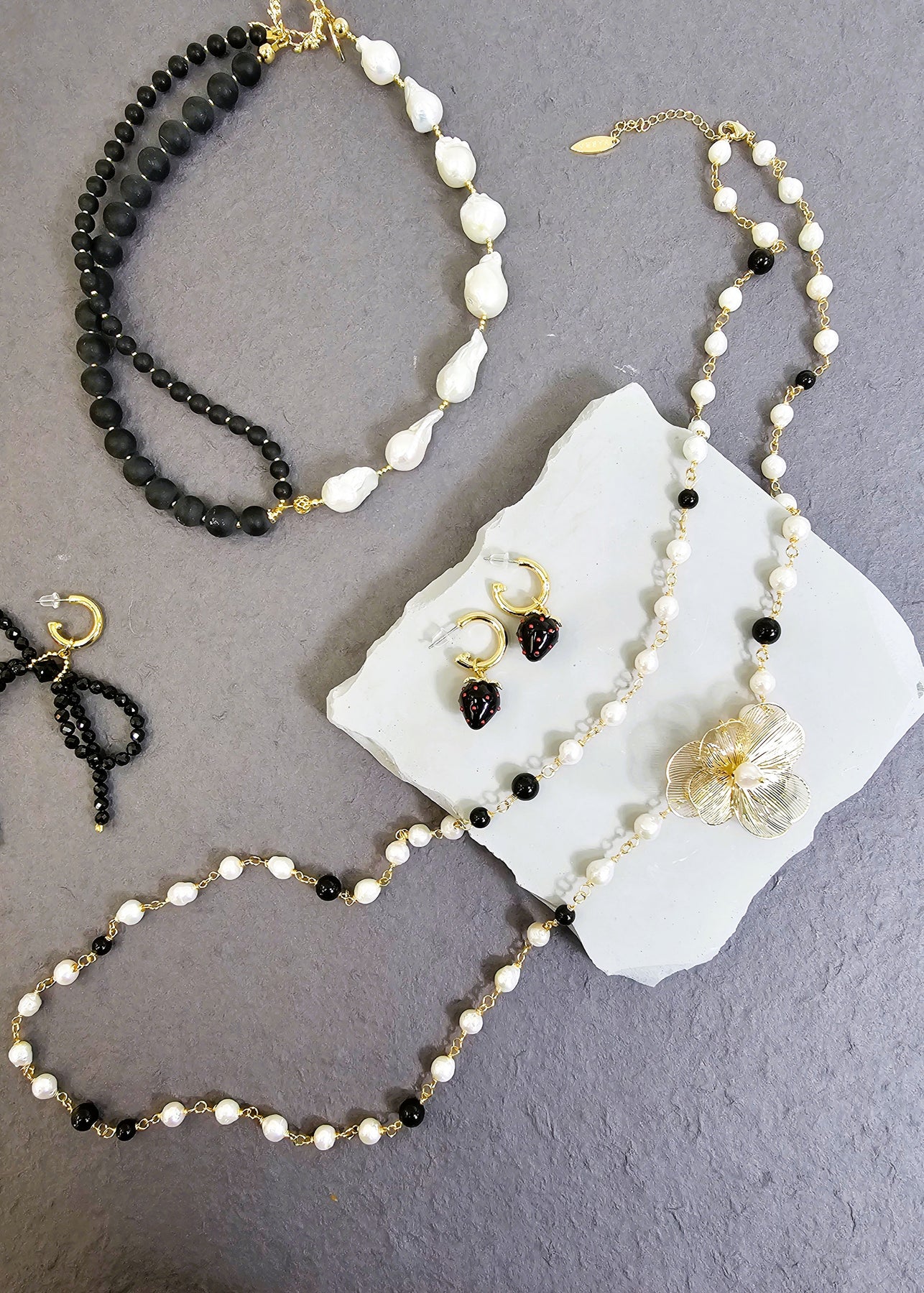 It is a stunning piece that effortlessly blends classic elegance with contemporary style. This exquisite necklace features lustrous freshwater pearls interspersed with striking black obsidian, culminating in a delicate flower charm that adds a whimsical touch. Its versatile length allows you to wear it as a single strand or double-layered, making it perfect for any occasion.