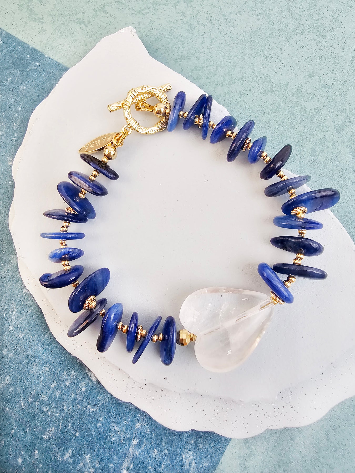 This elegant piece features beautifully crafted blue kyanite discs, known for their calming properties, paired with a striking heart-shaped white quartz centerpiece. The deep blue hues of kyanite, interspersed with delicate golden accents, create a stunning contrast that effortlessly draws attention. The heart-shaped white quartz not only adds a romantic touch but is also believed to enhance clarity and emotional healing.