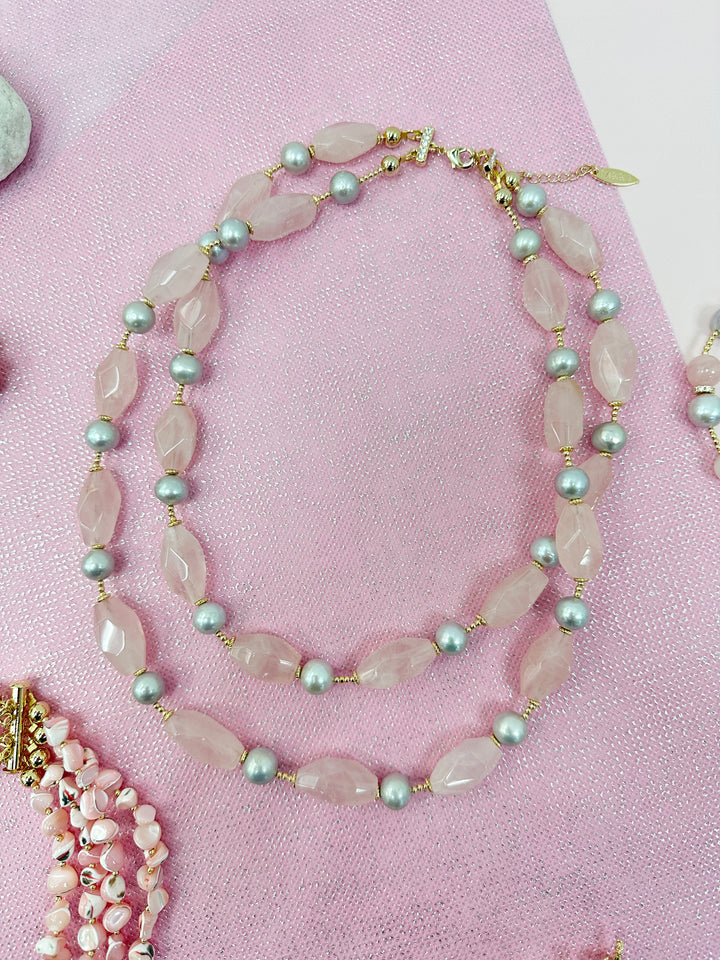 Pink Rose Quartz and Gray Freshwater Pearls Double Layers Necklace LN007 - FARRA