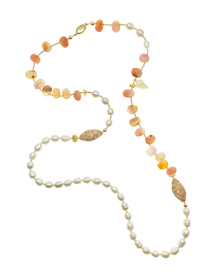 This multi-way necklace is made of orange agate and freshwater pearls with rhinestones and Japan golden plated brass findings. It can be worn as single long necklace or double wrapped as short necklace matching your outfit for any occasion. Color so feminine and pretty. Also, this is a nice gift for birthday, anniversaries or festival.