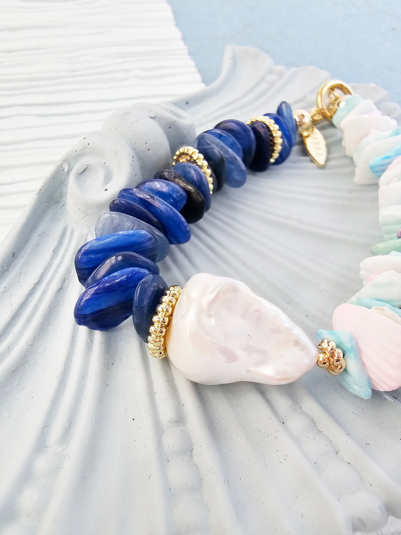This stunning piece features an enchanting combination of rich blue kyanite discs and vibrant colorful shell beads, creating a delightful contrast that captures the eye. The centerpiece, a lustrous baroque pearl, adds a touch of elegance and uniqueness, symbolizing individuality and beauty. Blue kyanite is renowned for its calming properties, promoting emotional balance and tranquility, making this bracelet not just a stylish accessory but also a source of positive energy.