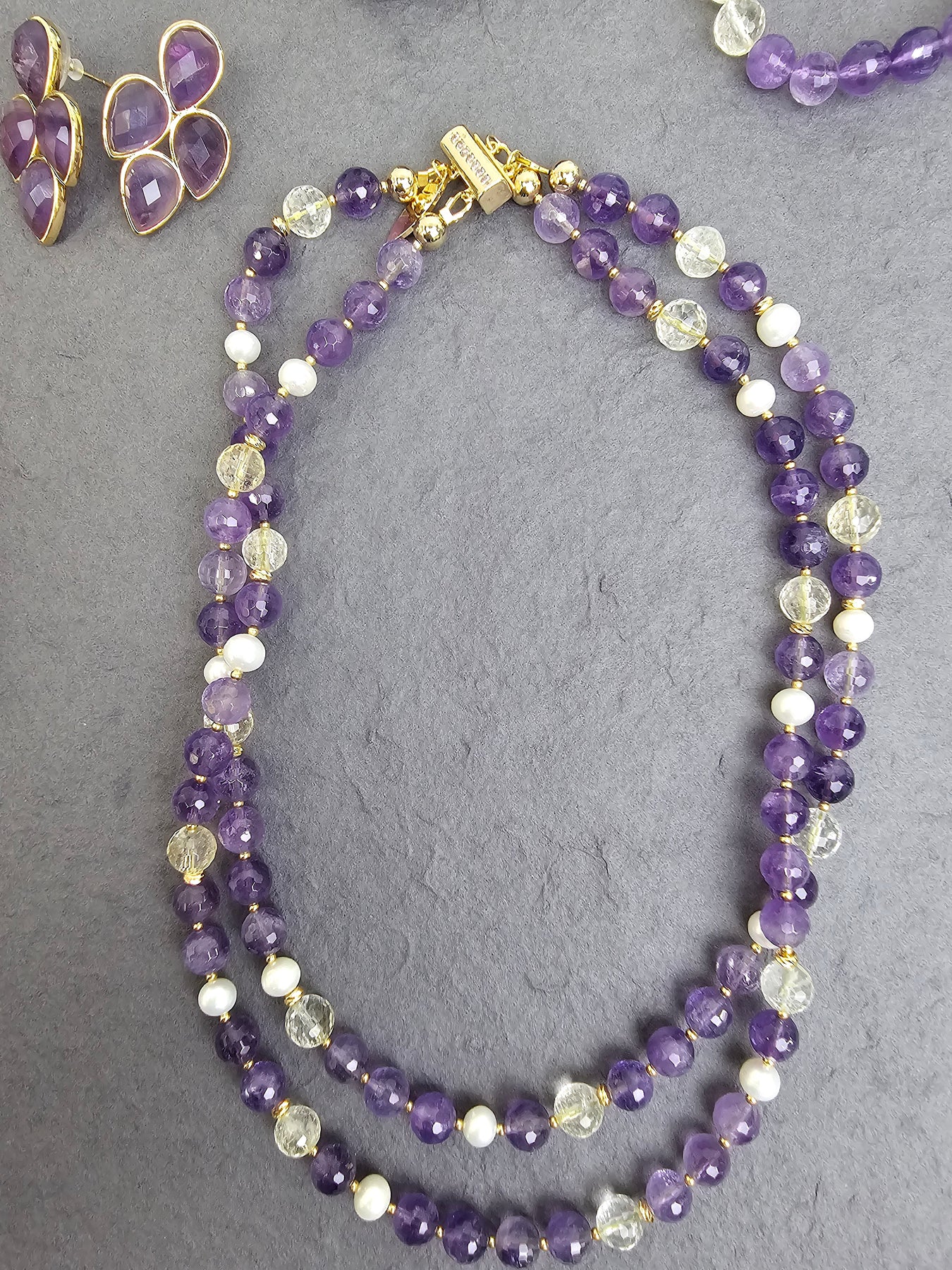 Designed with two layers, the necklace showcases the stunning interplay between the deep violet of the amethyst and the sparkling facets of the white quartz.