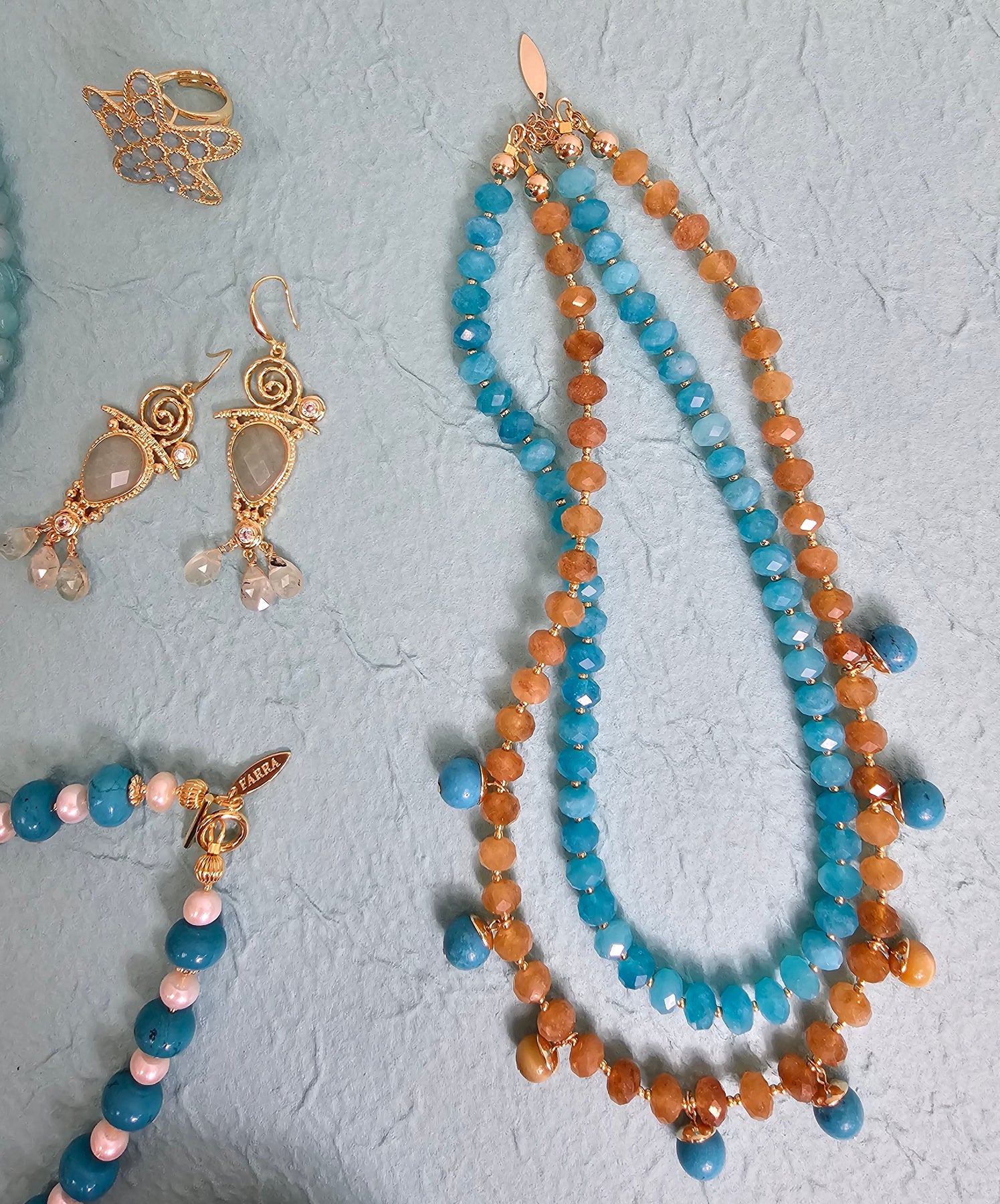 This striking piece features two layers of polished jade beads in harmonious shades of green and yellow, symbolizing balance, prosperity, and vitality. The rich colors and smooth textures of the jade create a captivating design that stands out beautifully, making it the perfect centerpiece for any outfit.