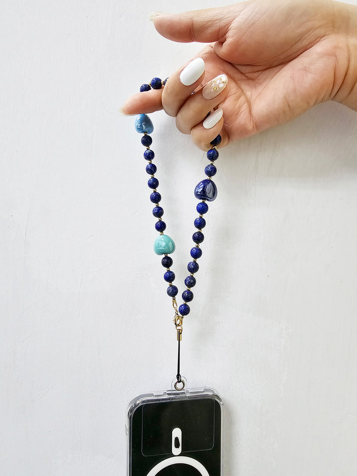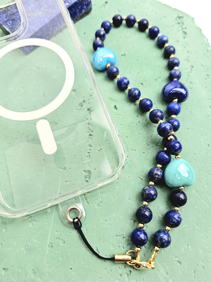 Complemented by charming blue ceramic heart accents, this phone strap adds a touch of elegance and playfulness to your everyday style. Crafted with high-quality materials for durability and comfort, it’s perfect for keeping your phone close while showcasing your unique personality. Elevate your accessory game and embrace the beauty of lapis lazuli