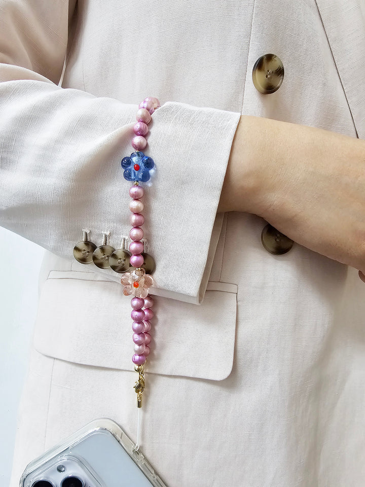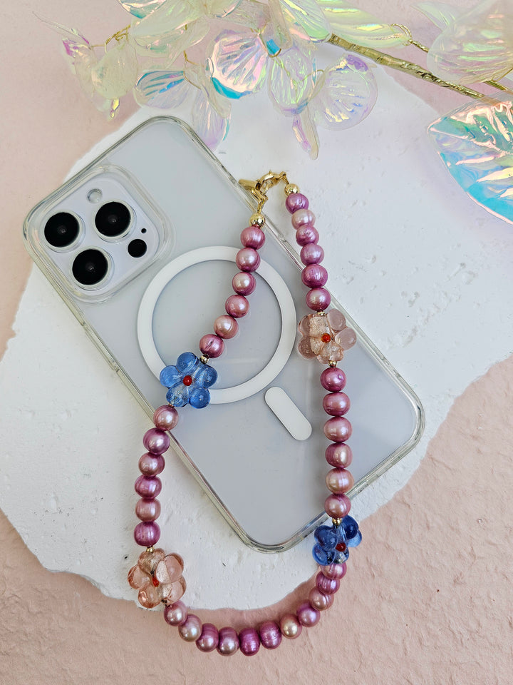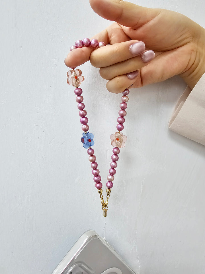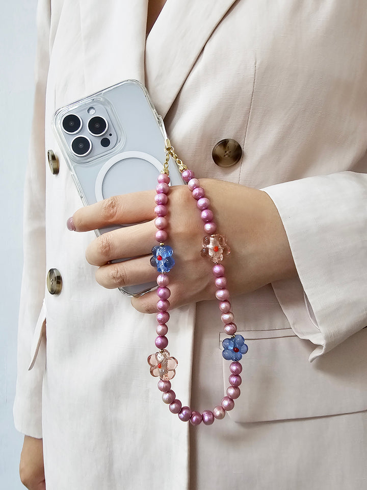 This phone strap is not only stylish but also functional, featuring a secure attachment for everyday use. The unique combination of luxurious pearls and eye-catching glass flowers makes it a perfect accessory for those looking to express their individuality.