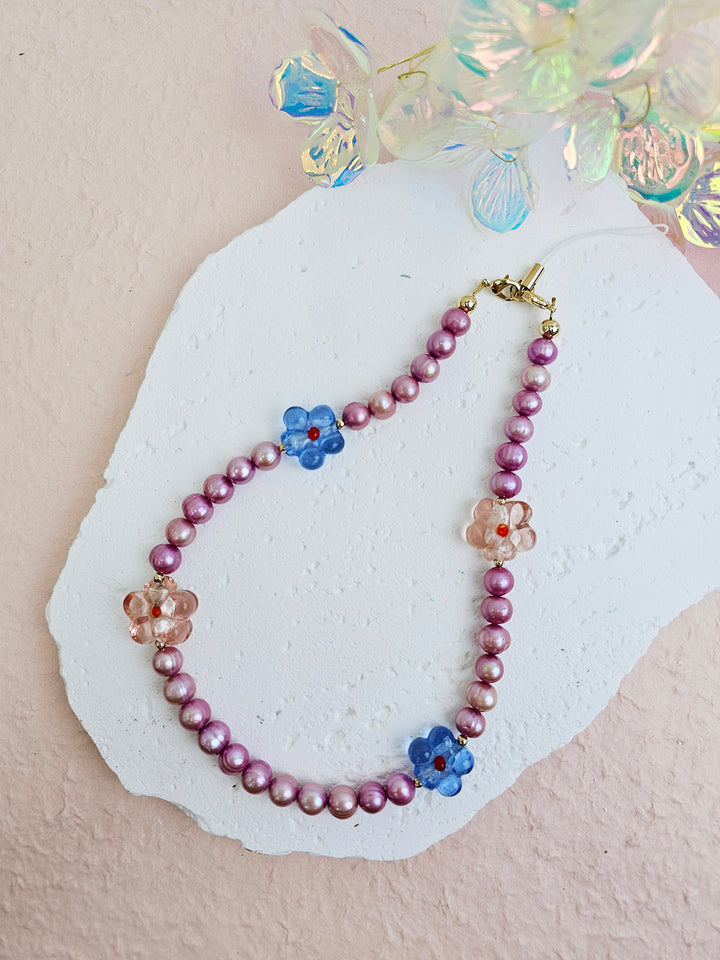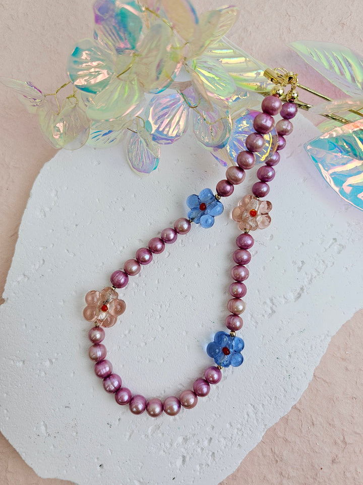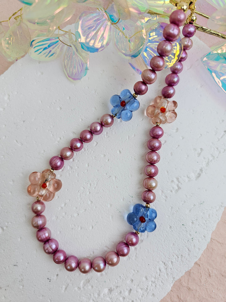 It is a charming accessory that combines the natural beauty of pink freshwater pearls with the vibrant elegance of glass flower accents. The soft pink hues of the pearls create a delicate and sophisticated look, while the colorful glass flowers add a playful and artistic touch.