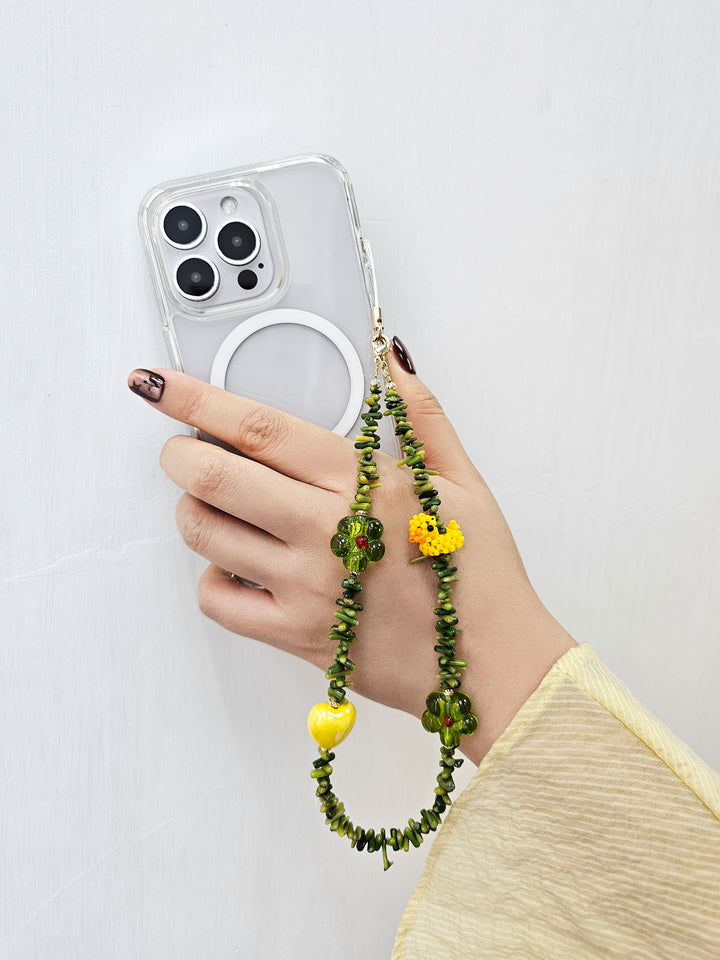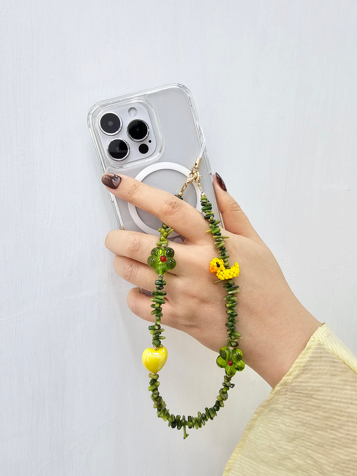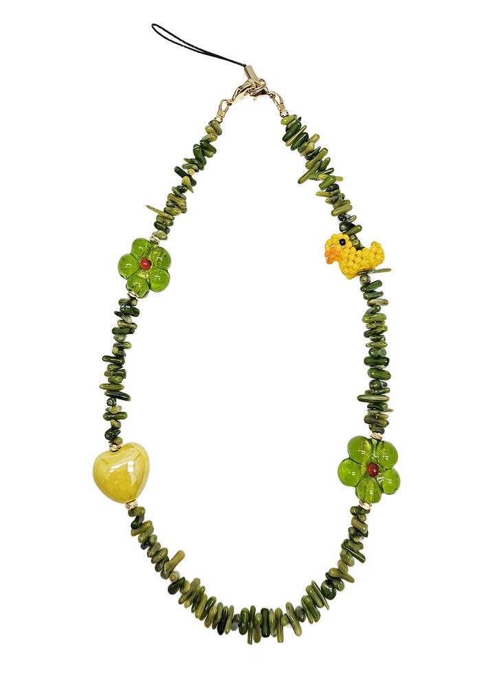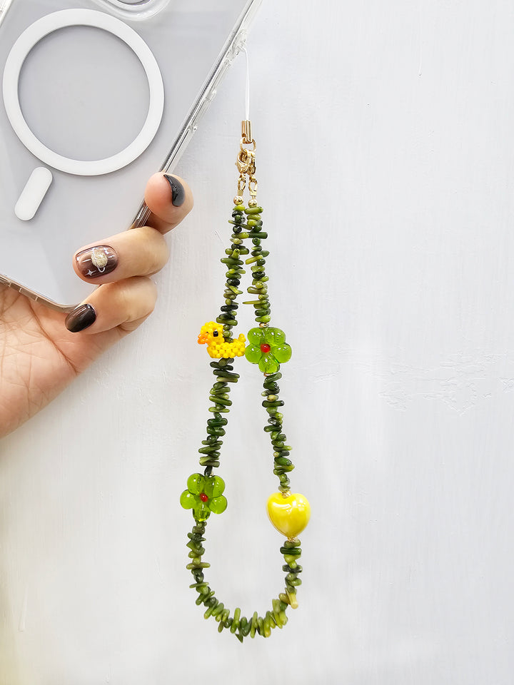 It is a charming accessory that brings a playful and vibrant touch to your device. Adorned with delightful elements like a cheerful yellow duck, a heart, and colorful flowers, this phone strap showcases a whimsical design perfect for expressing your personality. The green bamboo coral adds a unique texture and natural beauty, making it a standout piece.