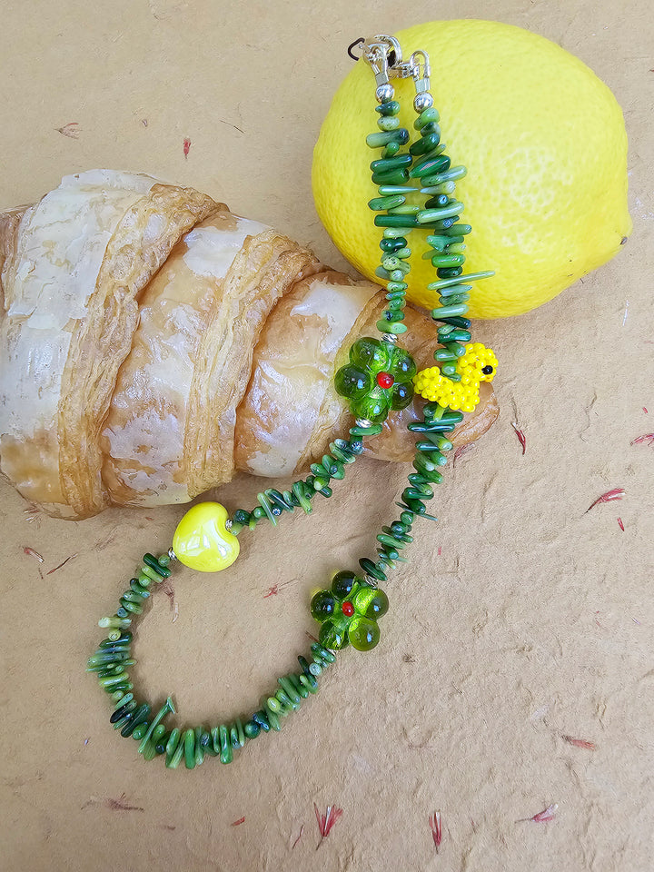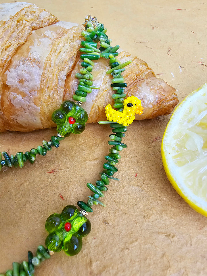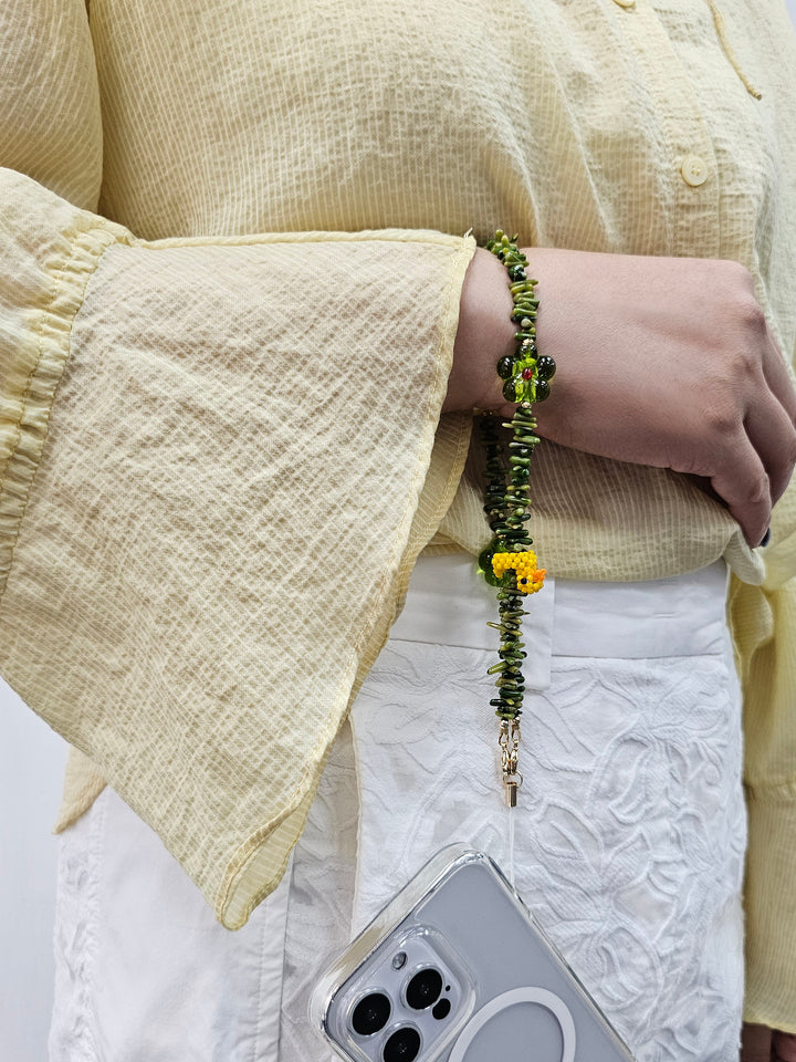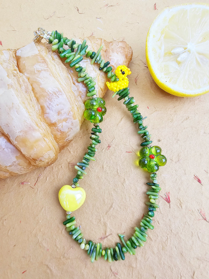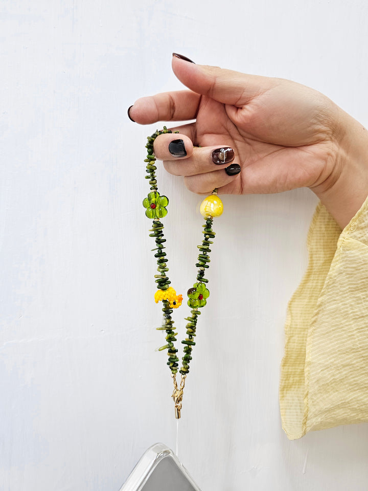 It is a charming accessory that brings a playful and vibrant touch to your device. Adorned with delightful elements like a cheerful yellow duck, a heart, and colorful flowers, this phone strap showcases a whimsical design perfect for expressing your personality. The green bamboo coral adds a unique texture and natural beauty, making it a standout piece.