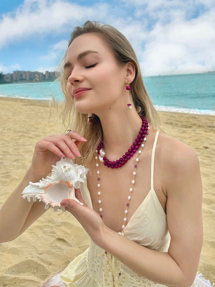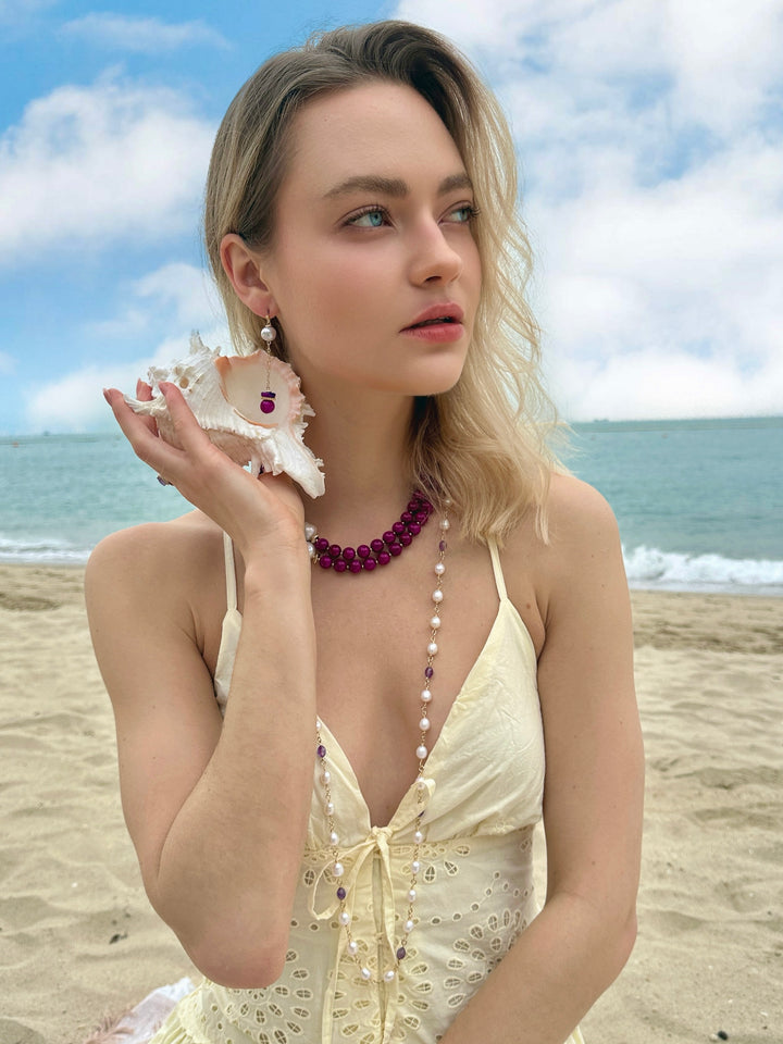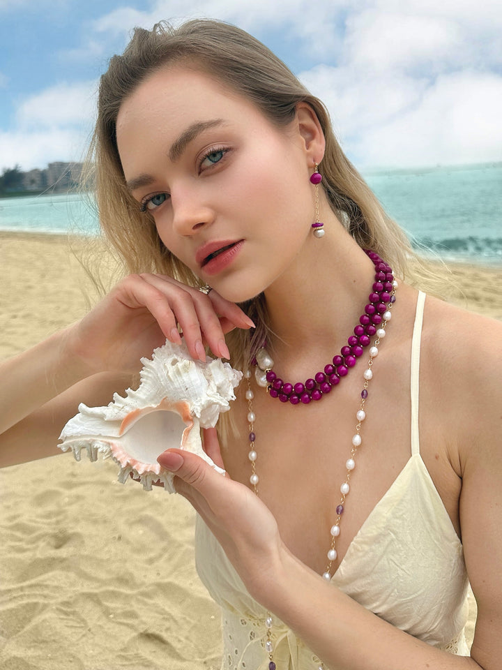 A vibrant and captivating combination of colors that celebrates the fun and beauty of color matching. These earrings feature lustrous gray freshwater pearls and vivid magenta sugilite gemstones, creating a striking contrast and a harmonious balance.