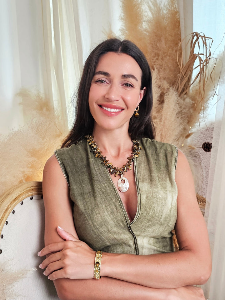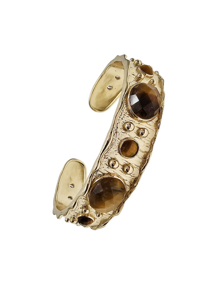 Elevate your style with our Tiger-Eye Stone Setting Gold-Plated Brass Bangle, a stunning fusion of natural beauty and artisanal craftsmanship. This eye-catching piece features exquisitely set tiger-eye stones, each showcasing their unique and rich, earthy tones. Known for its grounding properties, tiger-eye is believed to promote confidence, mental clarity, and protection, making this bangle not only a stylish accessory but also a meaningful talisman. The gold-plated brass adds a touch of luxury, beautifully contrasting with the natural hues of the stones.