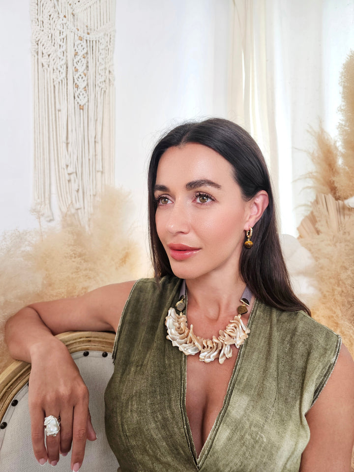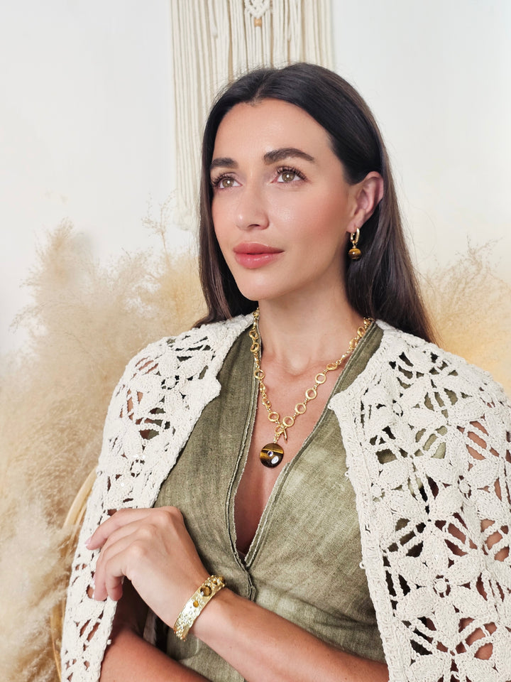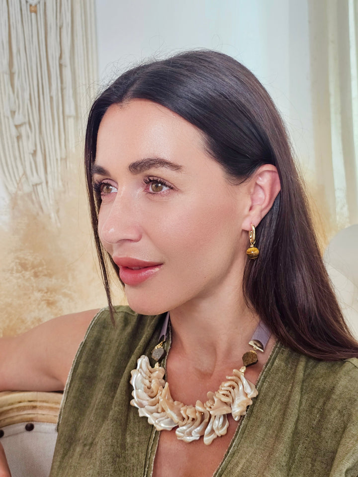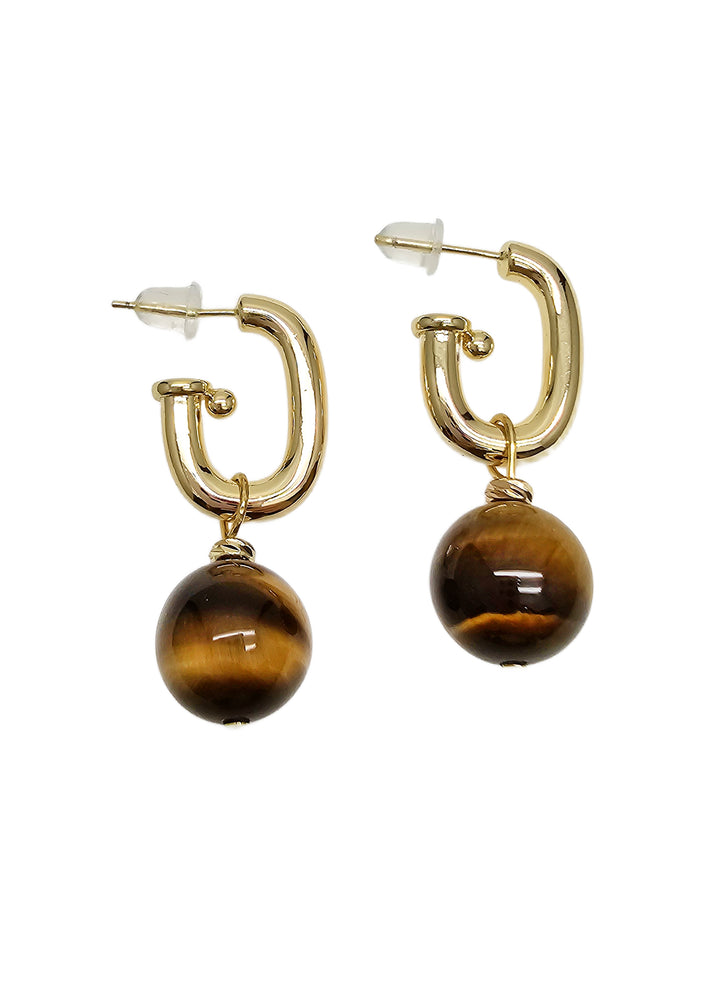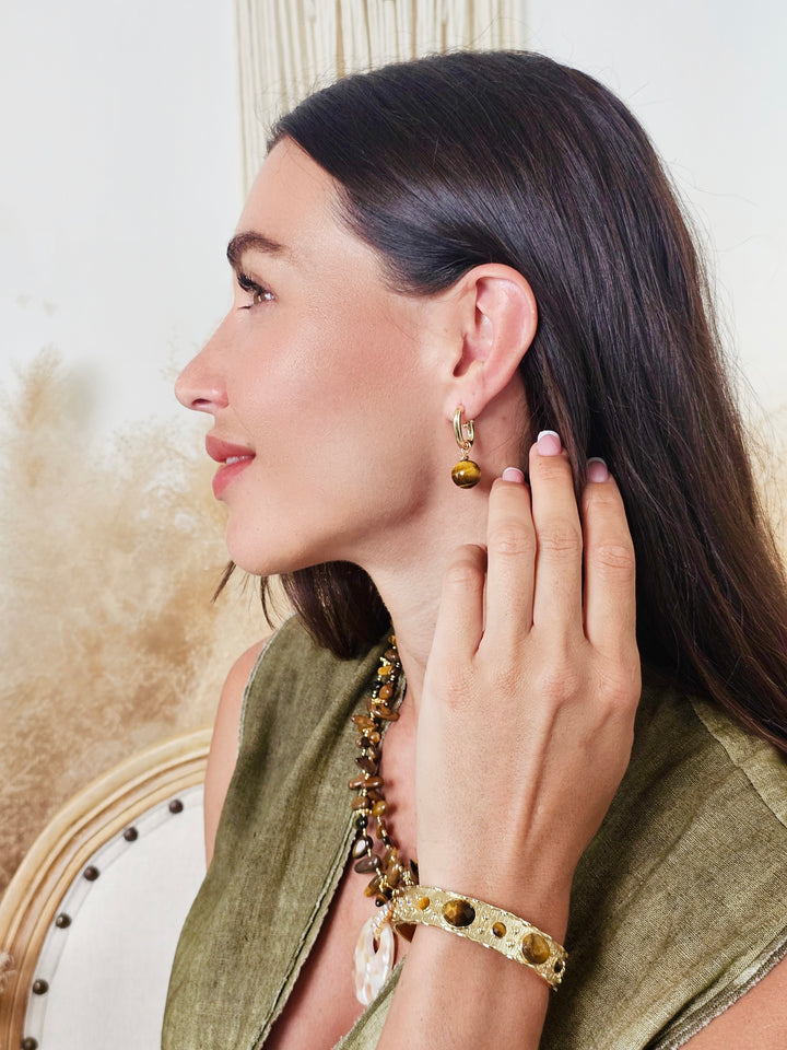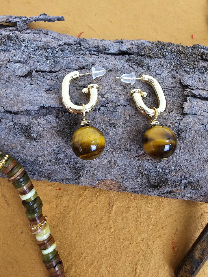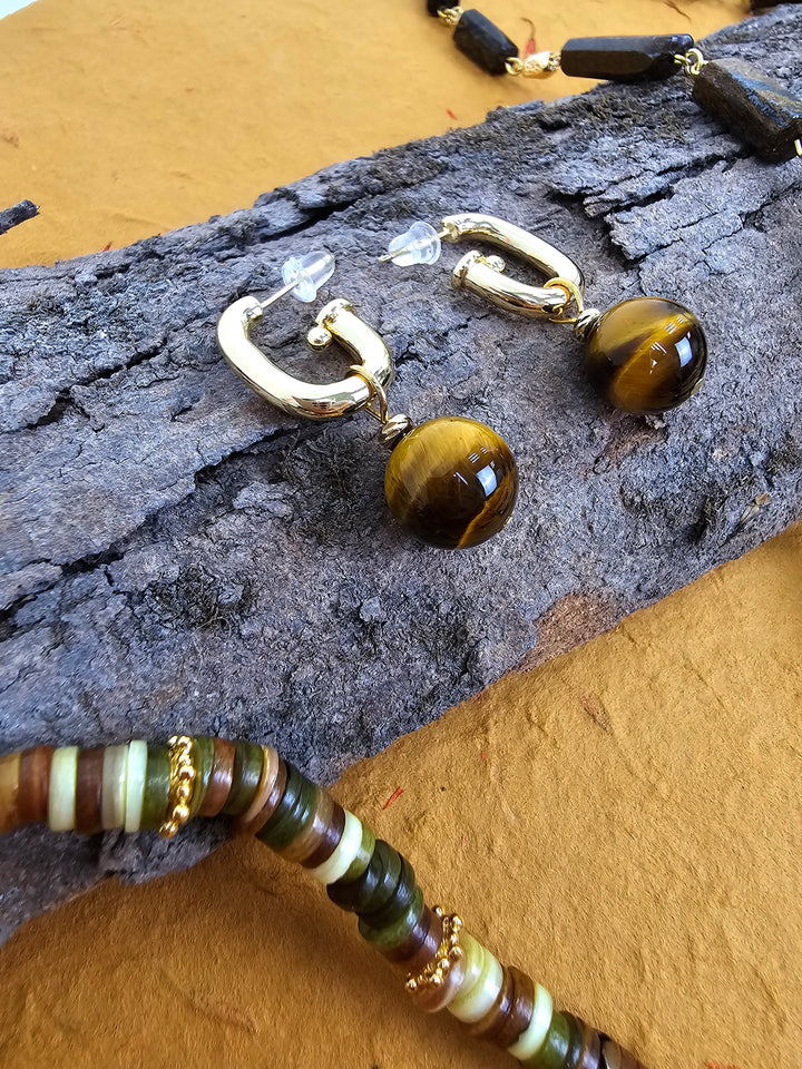 These contemporary earrings feature sleek, modern hoops paired with beautifully polished tiger-eye stones, known for their striking golden-brown hues and captivating chatoyancy. Tiger-eye is believed to enhance confidence, mental clarity, and protection, making these earrings a stylish yet meaningful addition to your collection.