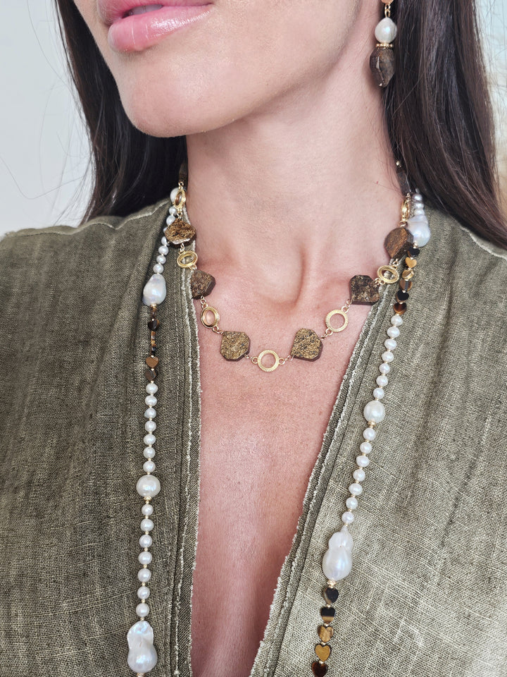 This stunning piece features lustrous baroque freshwater pearls, each uniquely shaped to create an organic, sophisticated look. The natural beauty of the pearls is beautifully complemented by a striking heart-shaped brown tiger-eye stone, known for its grounding properties and captivating chatoyancy. This necklace not only enhances your style but also serves as a reminder of inner strength and confidence.