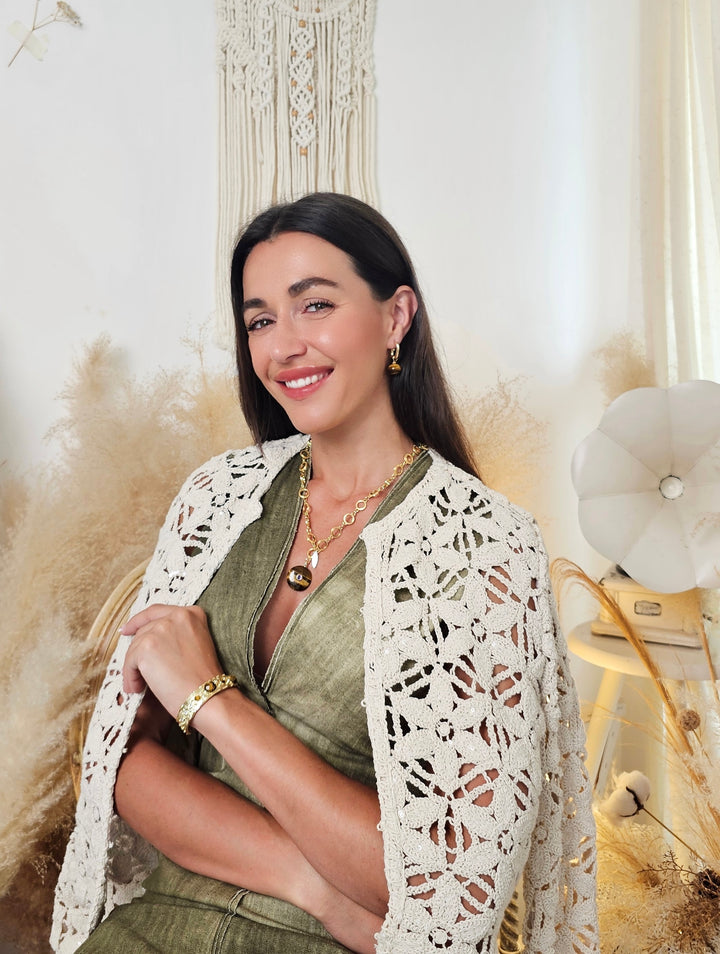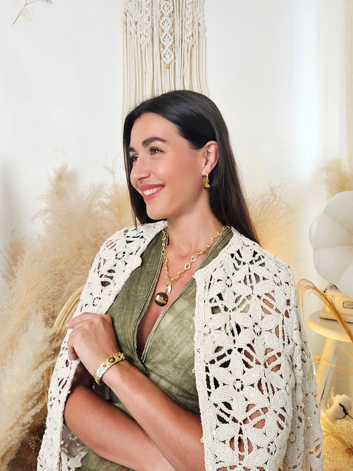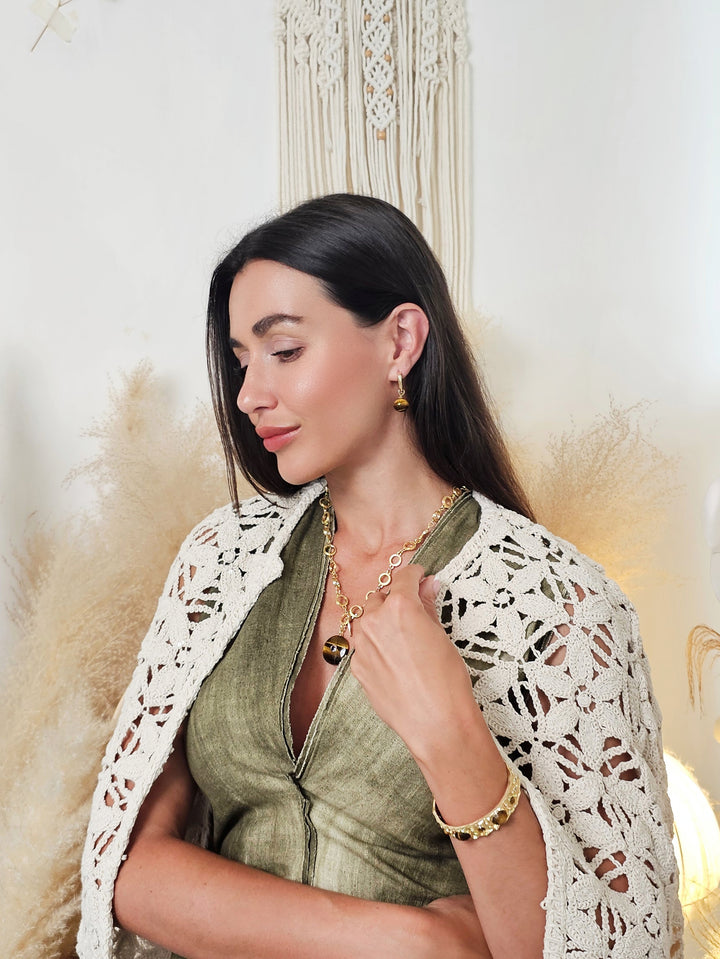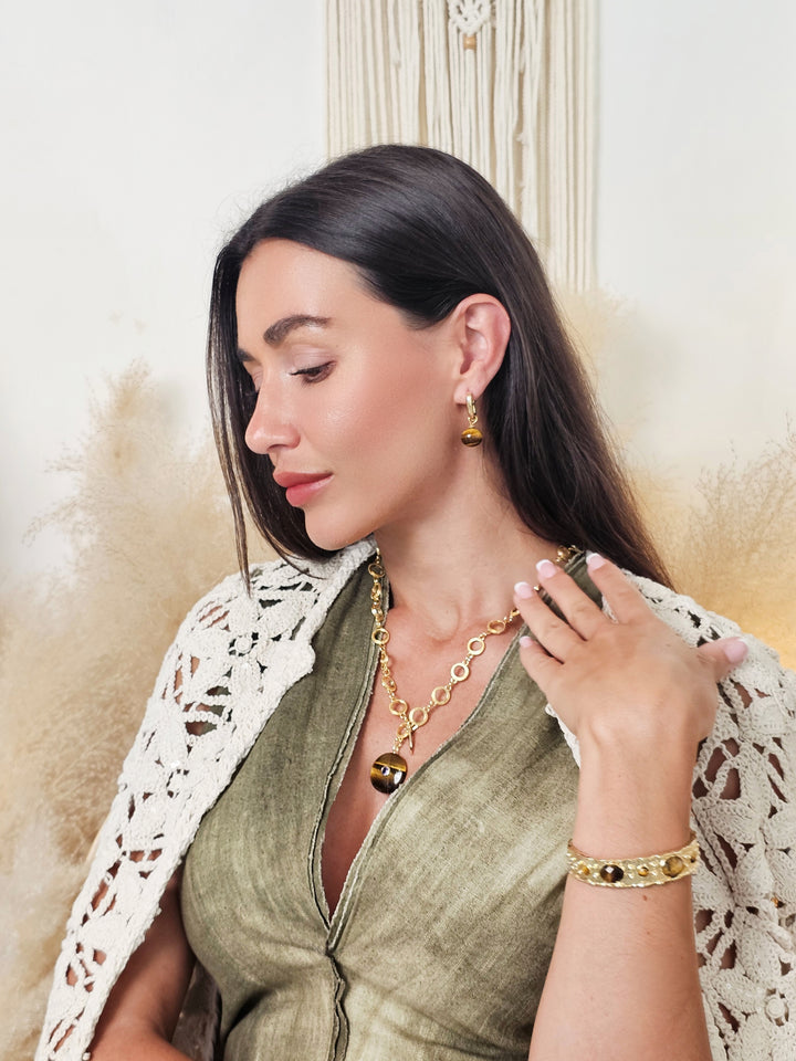 Introducing our Tiger-Eye Stone Pendant Necklace, a stunning accessory that beautifully marries natural elegance with modern design. Featuring a striking tiger-eye pendant, this necklace showcases the stone's captivating bands of gold and brown, known for their grounding and protective properties. The pendant is elegantly suspended from a delicate gold-toned chain composed of interlocking circles, adding a touch of sophistication to the overall look.