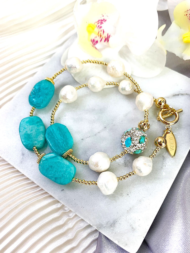 This handmade bracelet is made of freshwater pearls with amzonite with Japan golden plated brass findings. It can be worn as double wrapped bracelet or choker for any occasion. Style it your way and bring joy to your everyday. Pair with Farra earrings looks stunning ! Also, this is a very nice gift for birthday, anniversaries or festivals. It will be contained in a nice jewelry box with well packed.