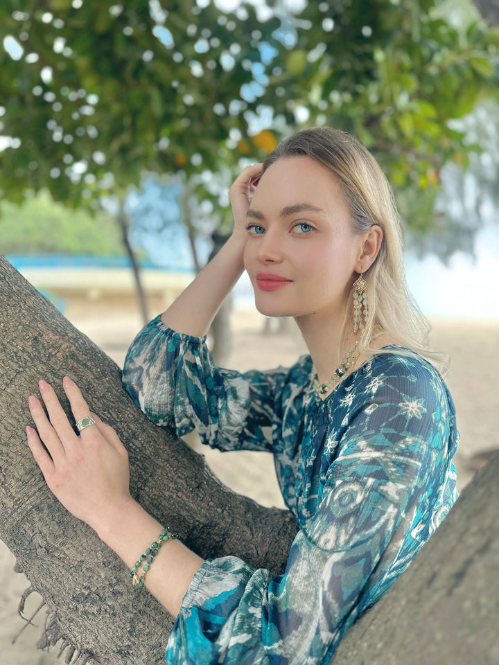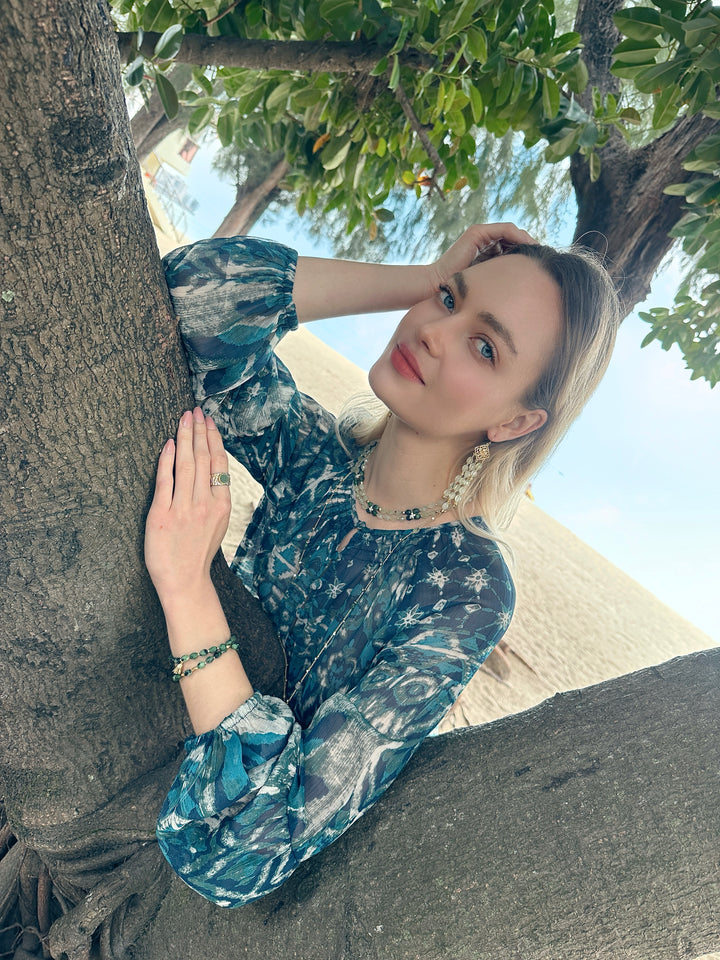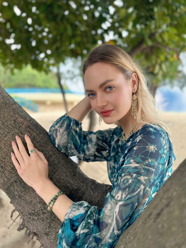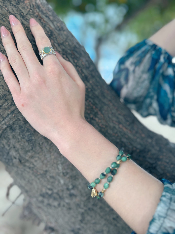 The gemstones used in this bracelet are green zoisite, known for their rich green color with unique patterns and inclusions. Each bead is carefully selected for its quality, creating a harmonious blend of natural beauty and earthy elegance. The green zoisite beads add a touch of vibrancy and a connection to nature.