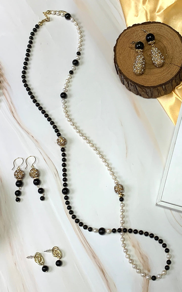 This handmade necklace is made of freshwater pearls ,Obsidian, rhinestones bordered pearls with Japan golden plated brass findings.  Black and white color comb which is timeless and elegant which can be worn as single long necklace or double wrapped as short necklace. Wear it with Farra black earrings to complete your look. This is also a very nice gift for birthday, anniversaries or birthday. It will be contained in a nice jewelry box with well packed.