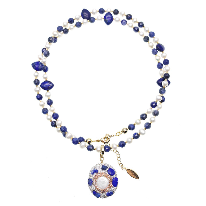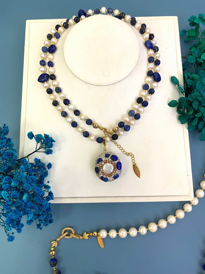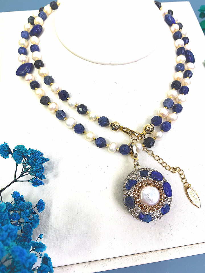This handmade necklace features removable pendant, freshwater pearls with lapis and Japan golden plated brass findings. It can be worn as long necklace or double wrapped to create your own styles. Matching with midi dress, knitwear or blouse for special events or everyday life. Also, this is a gorgeous gift for birthday or anniversaries. It will be contained in a nice jewelry box with well packed.