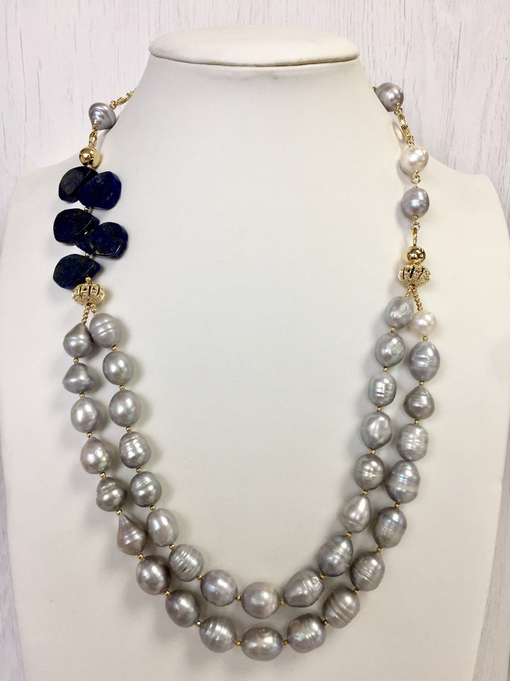 This necklace is made of grey freshwater pearls, natural lapis lazuli and golden plated brass findings. It can be worn with blouse, midi dress or straight-cut necklace top also looks gorgeous. Also, this is a nice gift for birthday, anniversaries or festival.It will be contained in a nice jewelry case and well packed.