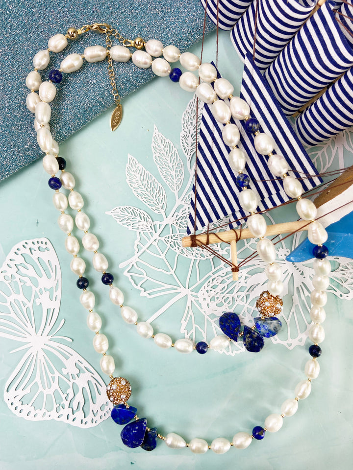 Freshwater Pearls With Lapis & Rhinestones Multi-Way Necklace GN019 - FARRA