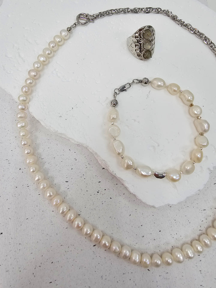 With this necklace, you can experiment with different arrangements: wear the OT clasp and chain at the front for a bold statement, or switch it up by positioning the pearls prominently in the center. For a more understated vibe, try displaying the pearls to one side, complementing your ensemble with an elegant touch. Whether you’re dressing up for a special event or keeping it casual, this necklace adapts to your style effortlessly.