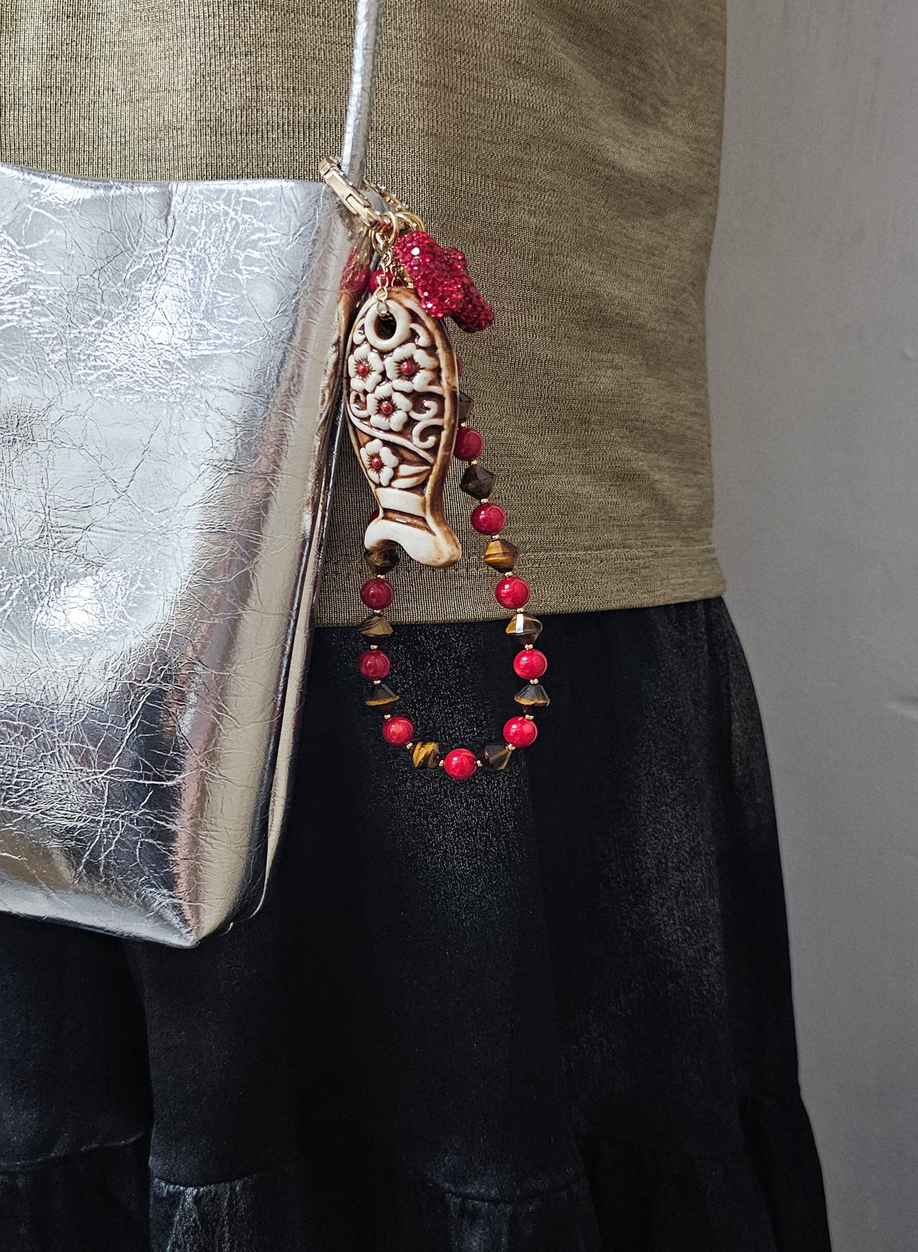 Designed for versatility and charm, this bag accessory can effortlessly enhance your favorite handbags, backpacks, or even serve as a quirky keychain. The combination of ceramic and gemstone beads creates a harmonious blend of textures and colors, while the secure clasp ensures that your charm stays in place. Perfect as a thoughtful gift for a loved one or a special treat for yourself, this charm is not just a decorative item.