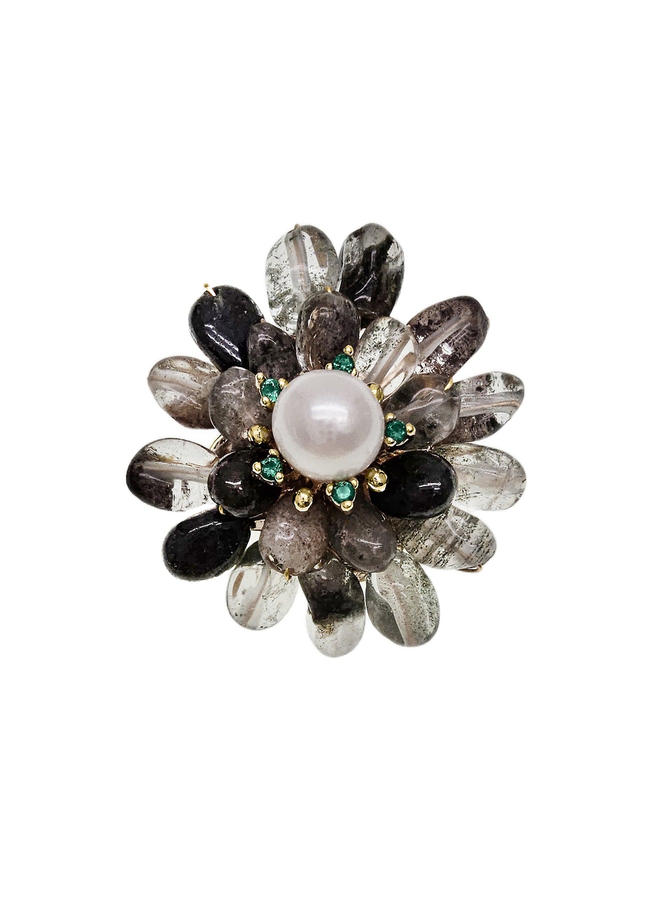 Featuring an array of black phantom quartz stones arranged in a floral design, this brooch highlights their unique patterns and textures. At the center, a lustrous pearl adds a touch of elegance, while delicate green accents provide a vibrant contrast that enhances the overall aesthetic.