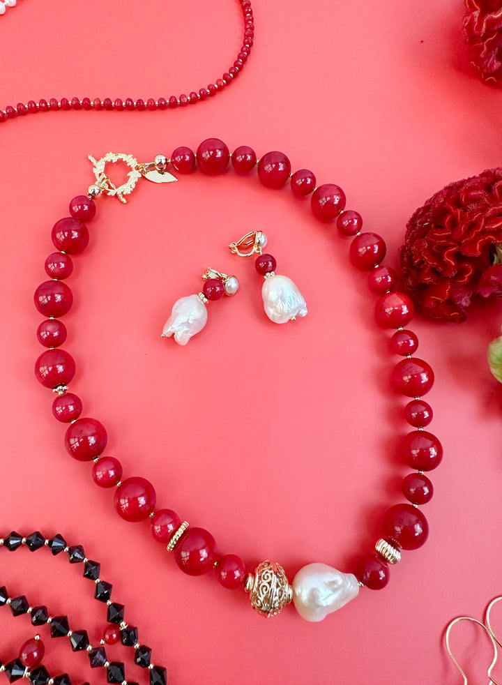 This exquisite necklace features large, chunky bamboo coral stones in a beautiful deep red color, interspersed with lustrous baroque pearls in varying sizes. Each coral bead has its own unique organic pattern, while the pearls add a touch of elegance and sophistication to this statement piece. It's perfect for adding a pop of color and sophistication to any outfit, whether you're dressing up for a special occasion or just want to add some glamour to your everyday outfit.
