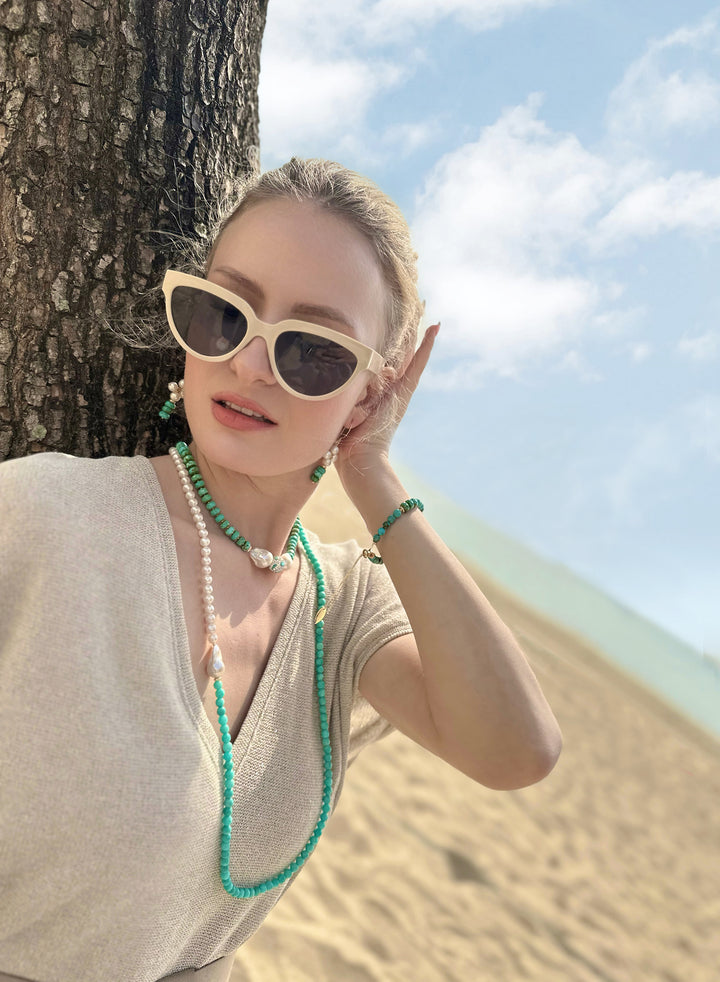 This handcrafted necklace features faceted turquoise with baroque pearls and rhinestones. Golden plated brass findings from Japan. Matching with blouse, midi dress and knitwear from beach to bar, all day long looks stunning! Pair with Farra turquoise earrings to create your own style. Also, this is an amazing gift for birthday or anniversaries. It will be contained in a nice jewelry box with well packed.