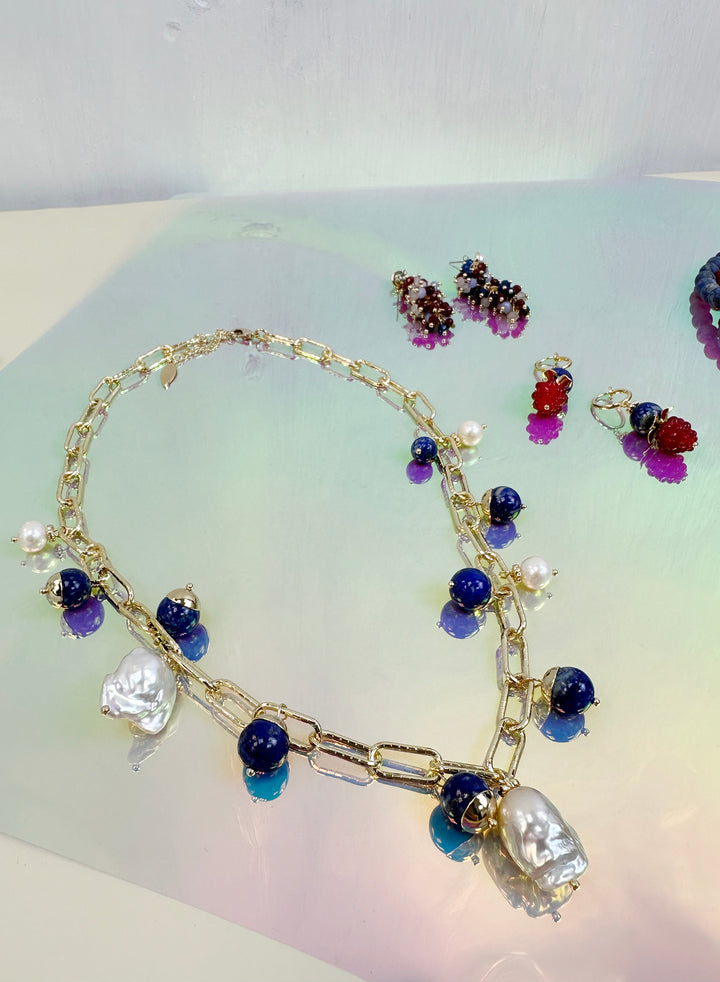 Gold Chain with Baroque Pearls and Lapis Charms Necklace JN022 - FARRA