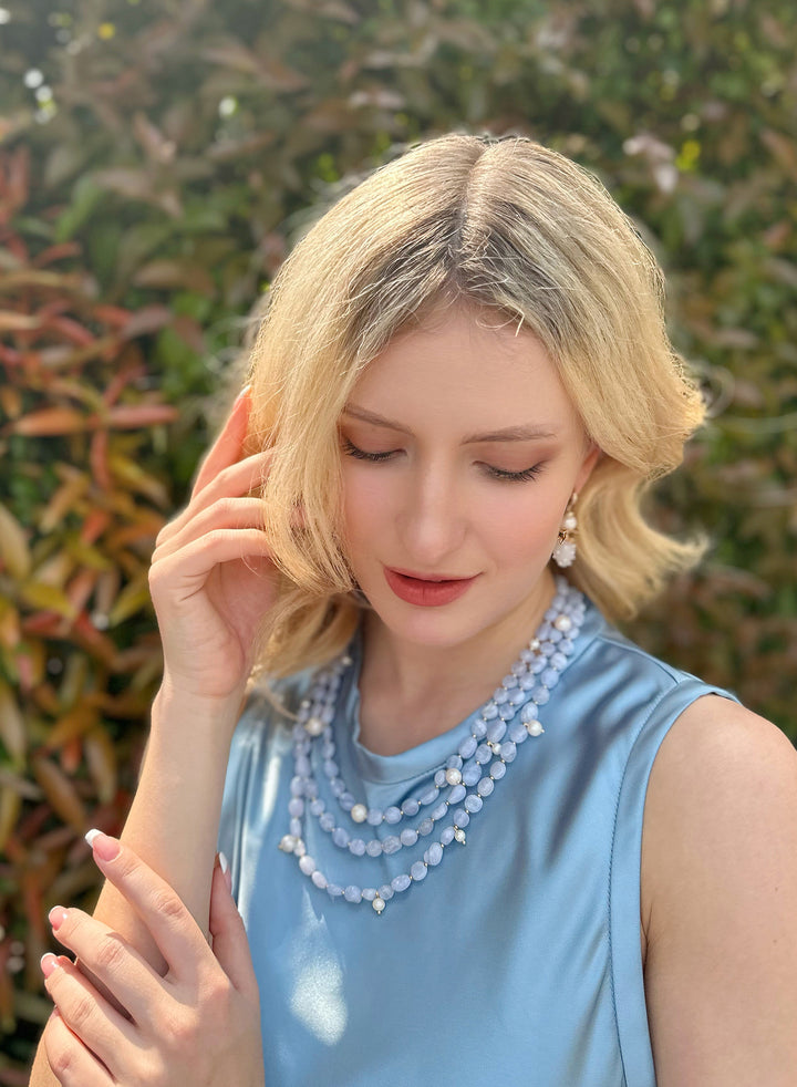 This multi-layered Blue Lace Agate necklace handcrafted with layers of stunning Blue Lace Agate gemstones, each with their own individual patternation and color combination. The adjustable chain allows for a customized fit, so you can wear it at the length that best complements your outfit.The necklace includes multiple strands of Blue Lace Agate, creating a layered effect that adds depth and dimension to any outfit. It will be contained in a nice jewelry.