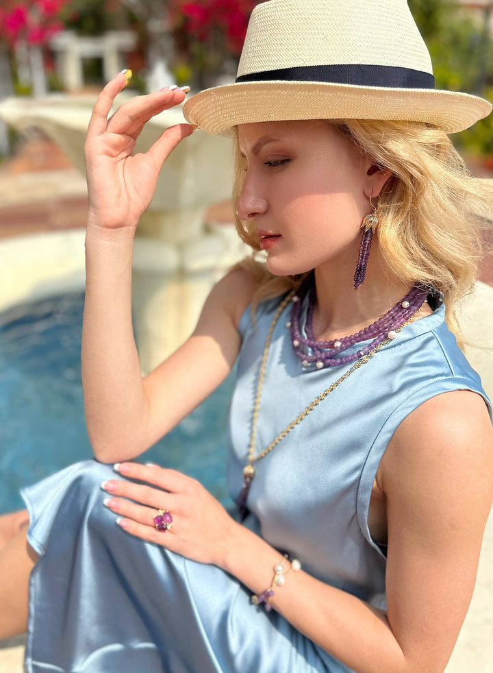 Magnify your elegance with our stunning multi-layered amethyst necklace. This piece is lovingly crafted with high-quality amethyst stones, perfectly arranged in multiple layers. The blend of rich, deep purples in the stones creates a mesmerizing effect that is sure to catch everyone's eyes. It will be contained in a nice jewlery box with well packed.
