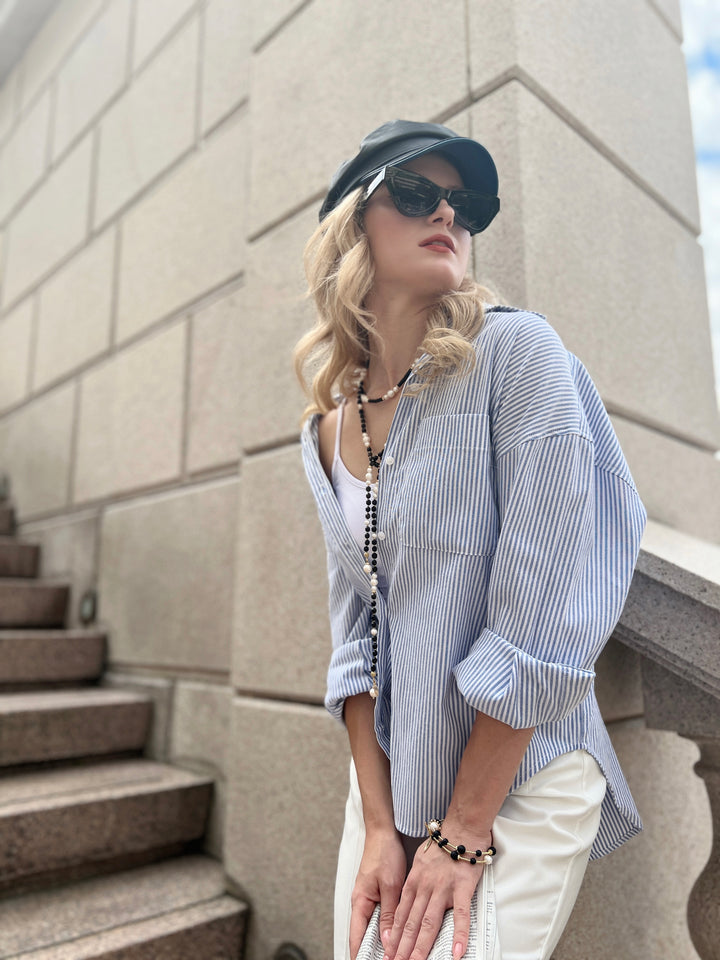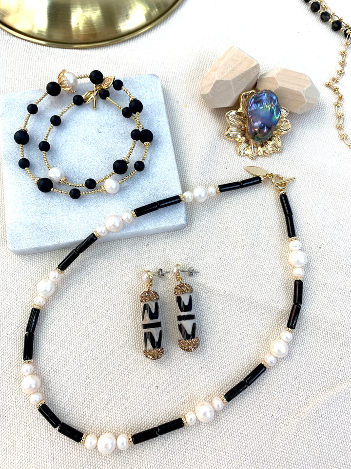 This Tube Black Agate with White Pearls Short Necklace is a sophisticated and exclusive piece of jewelry. Its combination of black agate and white pearls creates a beautiful contrast, perfect for any luxury wardrobe. Ideal for special occasions, this unique necklace will add a touch of artful elegance to your look.