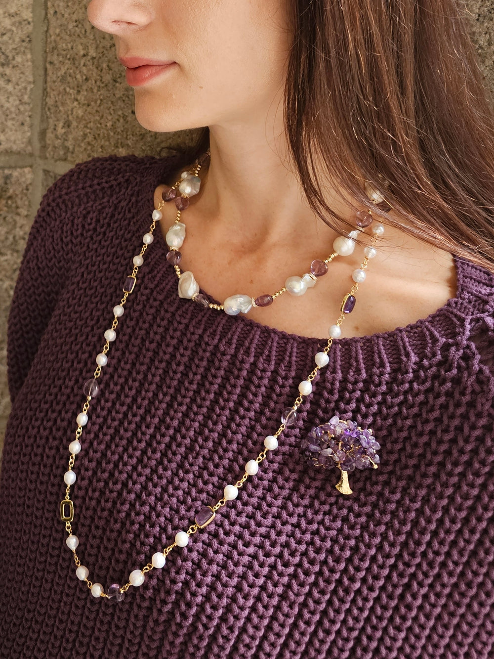 Natural Cultured Freshwater Pearls with Purple Gemstone Necklace LN011