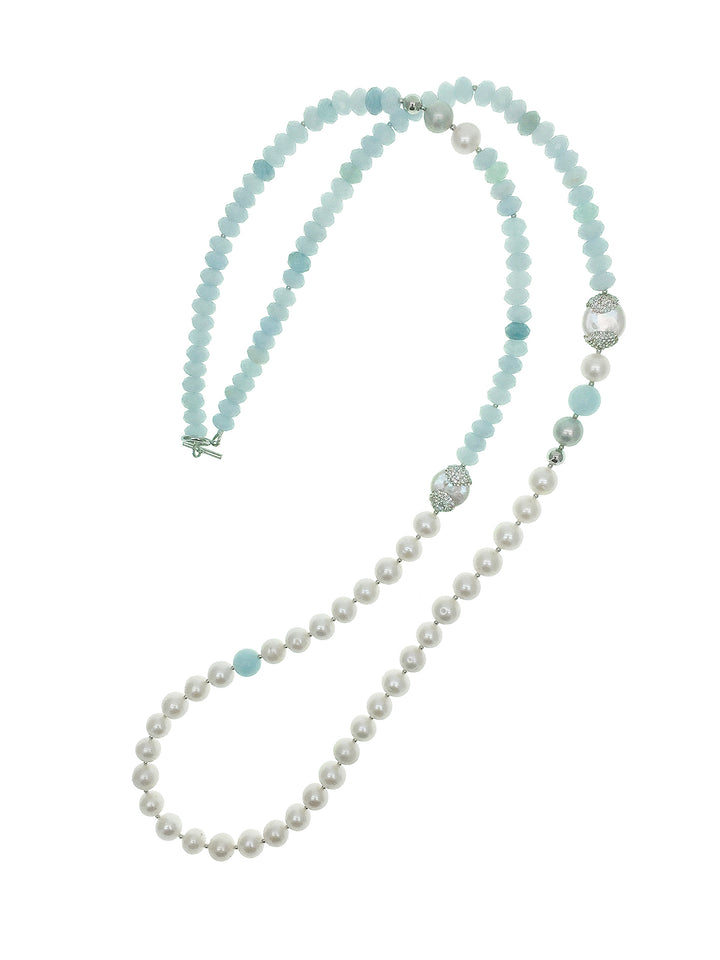 Freshwater Pearls With Aquamarine Long Necklace MN103 - FARRA