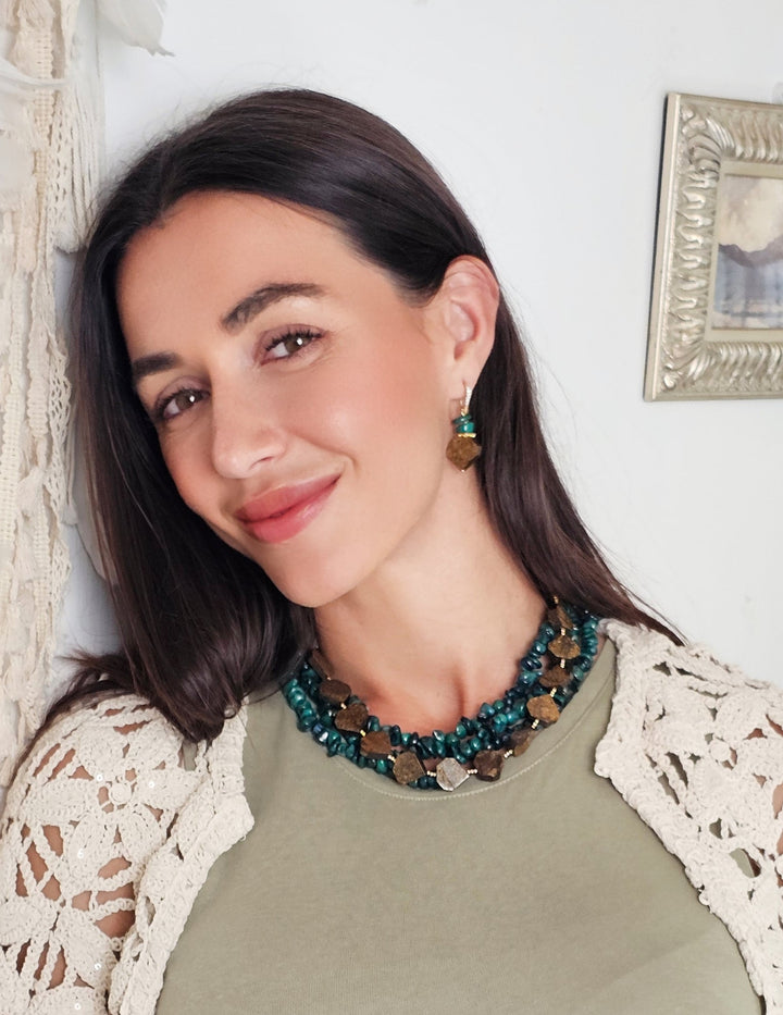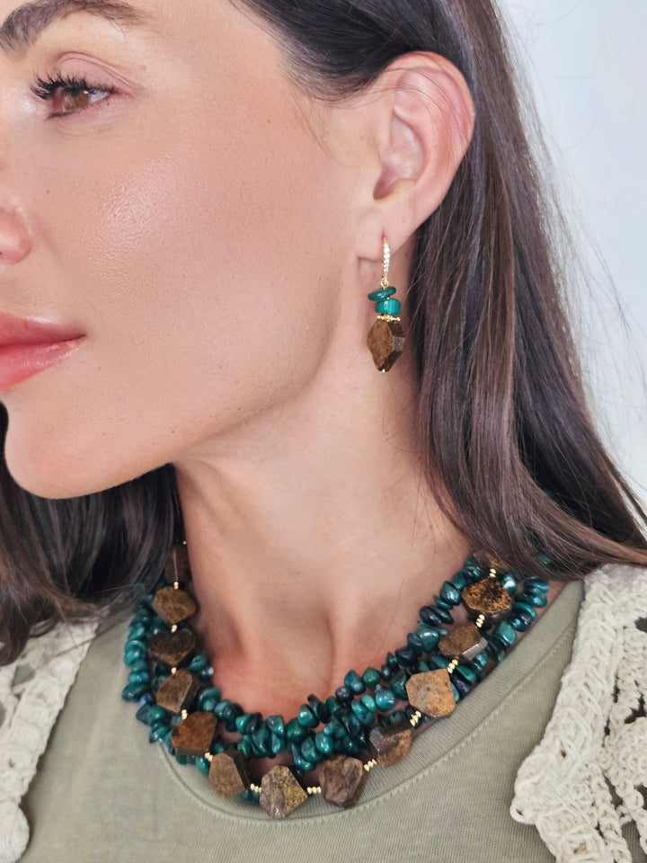 These earrings beautifully showcase a combination of brown tiger-eye and green bamboo coral, creating a striking accessory that balances earthy tones with vibrant hues. The hexagonal shape of the tiger-eye pieces highlights their unique chatoyancy, adding depth and intrigue. Tiger-eye is often associated with clarity and strength, making these earrings not just a fashion statement but also a symbol of resilience and confidence.