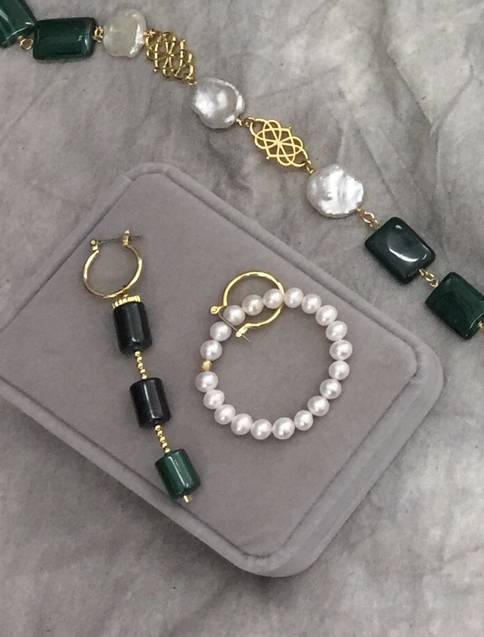 This pair of unbalanced earrings is made of nautral malachite and freshwater pearls with Japan golden plated brass findings. Matching with blouse or midi dress and tie up your hair looks gorgeous! Also, this is a very nice gift for birthday, anniversaries or festvials.