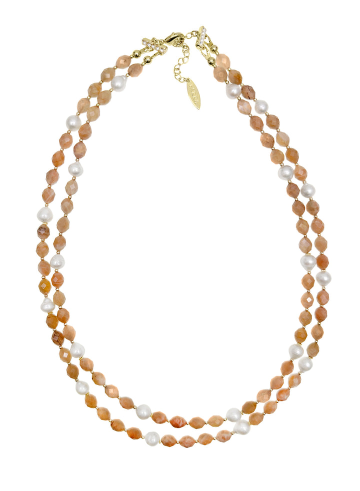 Double Layers Orange Moonstone With Freshwater Pearls Necklace NN009