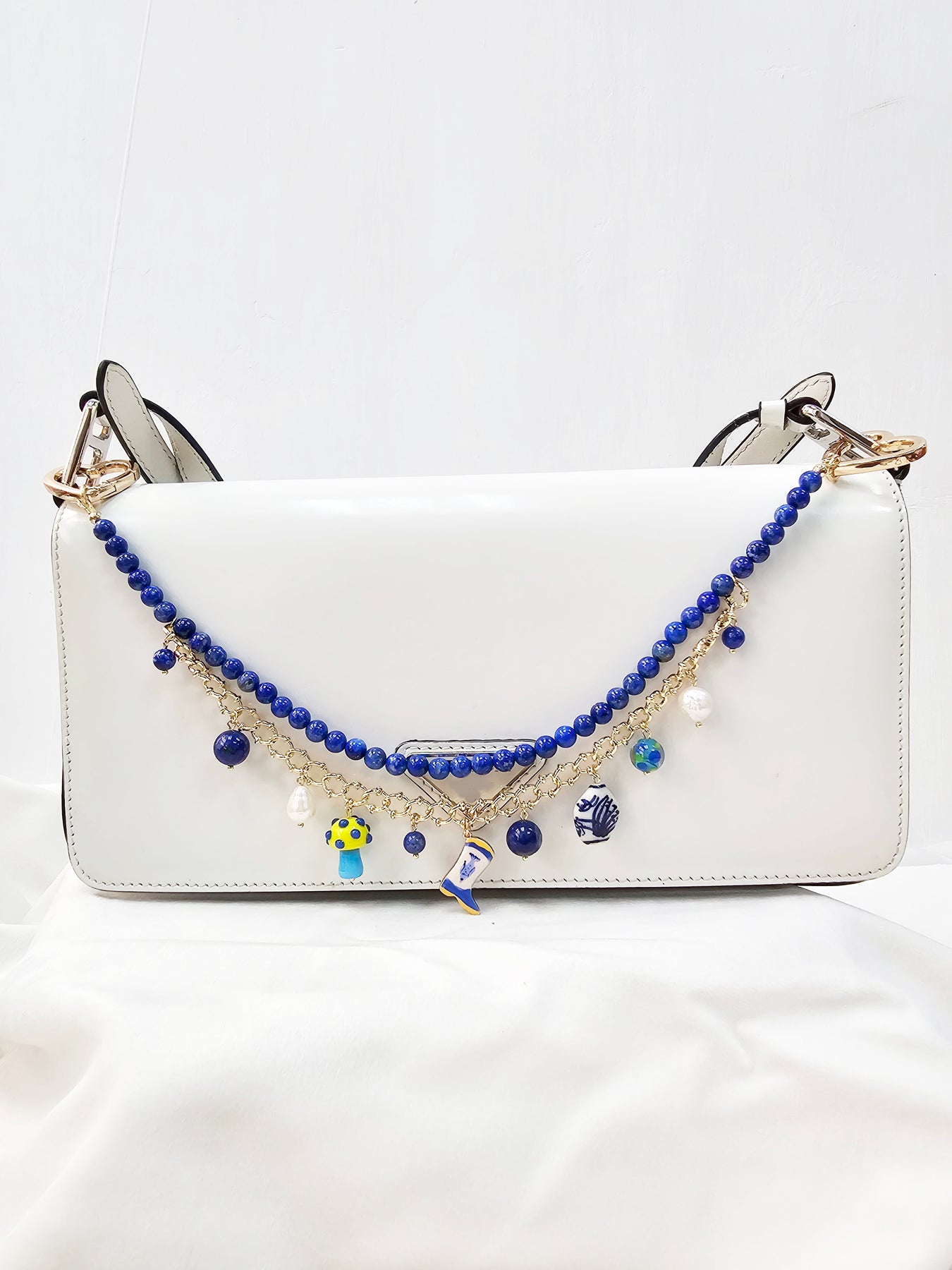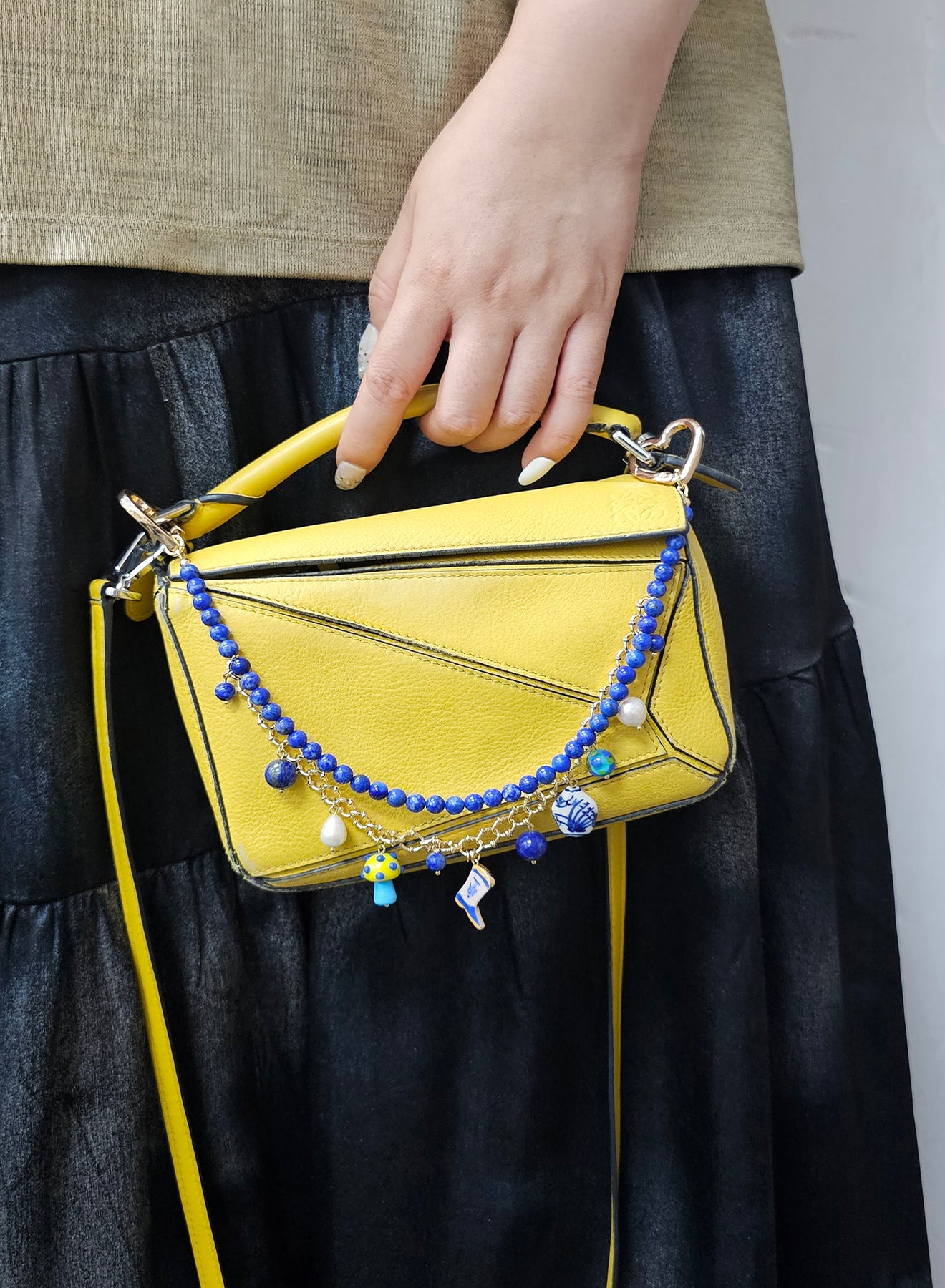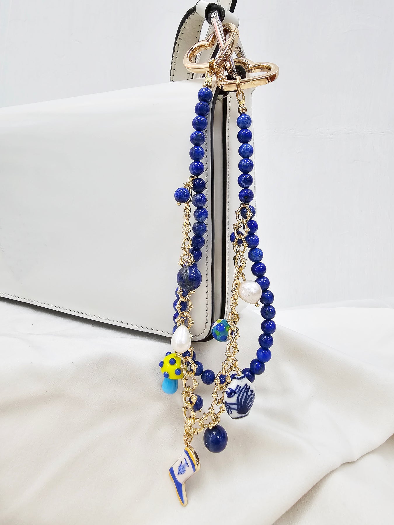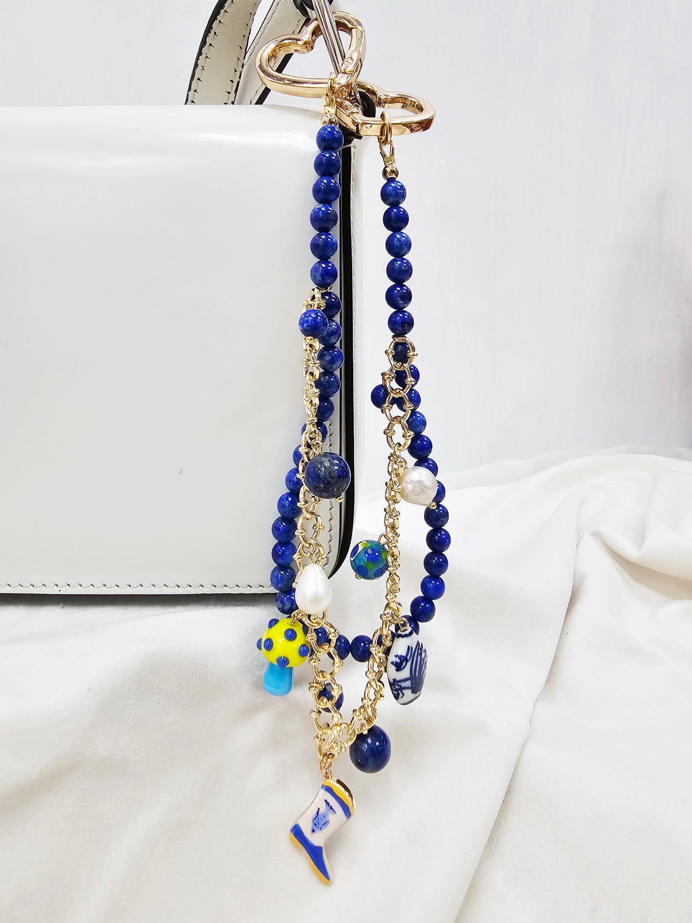 Adorned with playful charms, including a charming mushroom, cute boots, and a ceramic vase, this bag charm adds a fun and unique flair to any bag. The vibrant blue hues combined with the playful elements make it perfect for decorating your bag and making it even more beautiful.