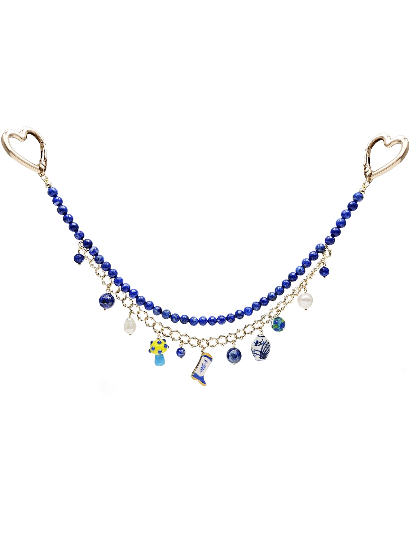This whimsical piece features stunning lapis lazuli beads, known for their deep blue color and protective properties, beautifully layered with freshwater pearls that offer a touch of elegance.