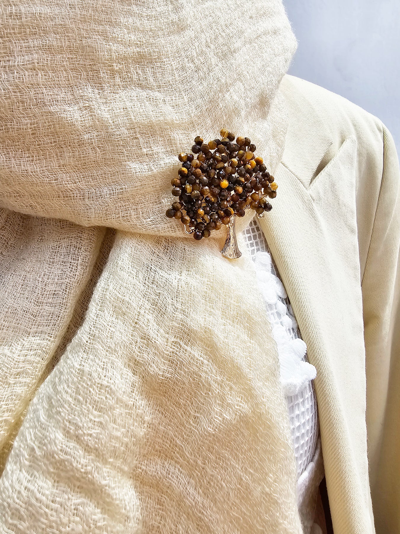 This handcrafted tree-shaped brooch is a stunning piece made from tiger-eye stones, showcasing their rich golden-brown hues and distinctive chatoyancy. The intricate design mimics the natural beauty of a tree, with the tiger-eye beads representing the leaves, each adding depth and texture. This brooch not only serves as a unique accessory but also symbolizes growth, strength, and resilience, reflecting the enduring qualities of nature.