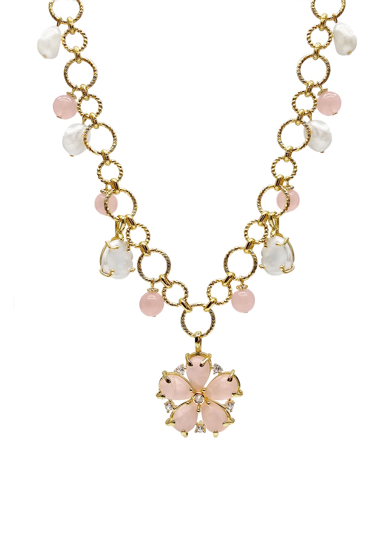 This exquisite necklace features a textured gold-tone circular link chain beautifully interspersed with lustrous white pearls and smooth pink beads, culminating in a stunning five-petal rose quartz flower pendant accented with sparkling crystals. Rose quartz is renowned as the stone of unconditional love, promoting emotional healing and inner peace, while pearls are traditionally associated with purity and calming energy.