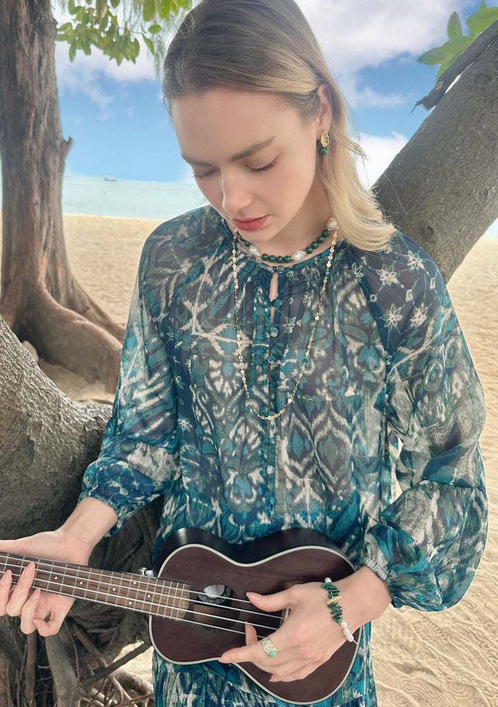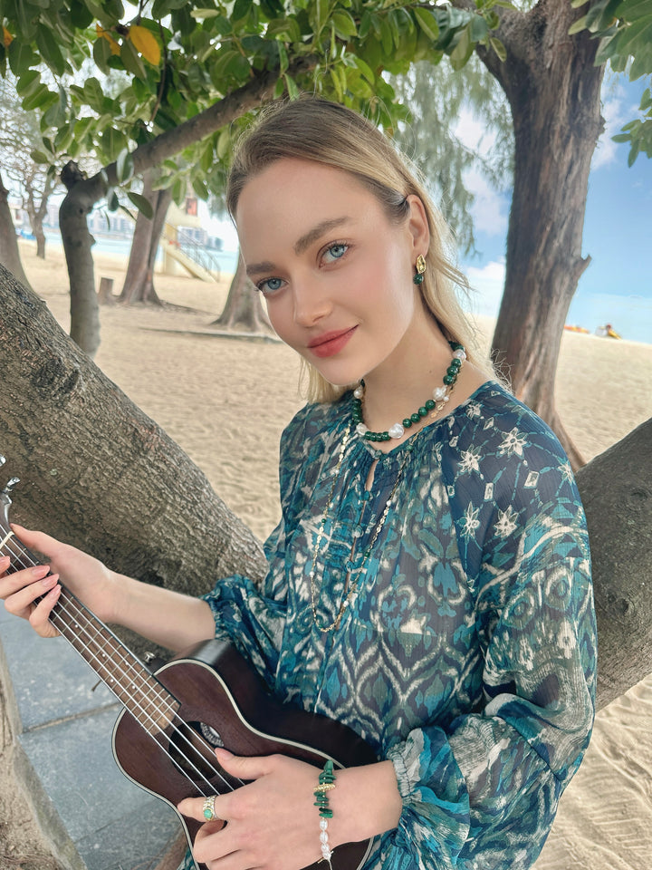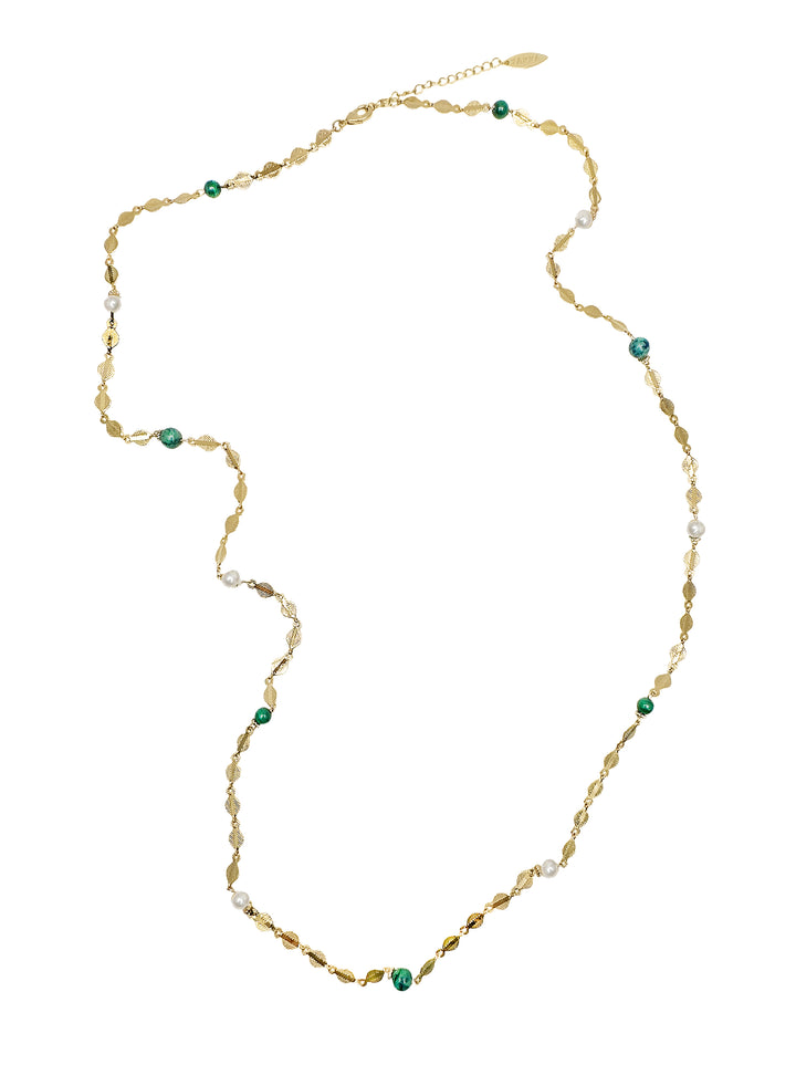 The necklace features a 14K gold-plated brass chain that adds a touch of luxury and sophistication to the overall design. Adorning the chain are a series of green gemstones, which add a vibrant pop of color and a sense of nature's beauty. The green gemstones infuse the necklace with a refreshing and eye-catching appeal, creating a captivating contrast against the white freshwater pearls.