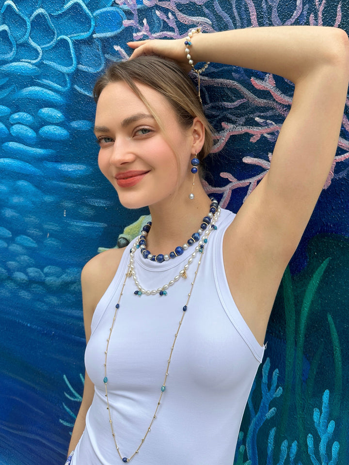 Materials: natural lapis, gray freshwater pearls, 14K gold plated brass