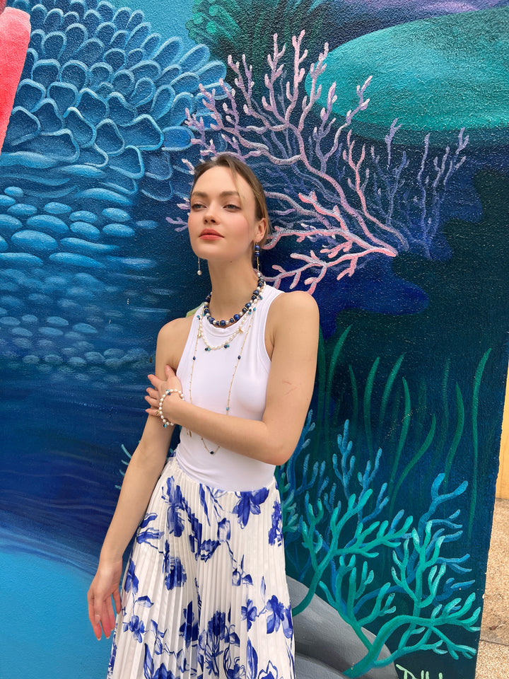 The lapis lazuli gemstones showcase the natural beauty with its deep blue color and golden flecks. Known for their lustrous surfaces and soft gray hues, freshwater pearls exude a classic and timeless elegance. The smooth and round shape of the pearls contrasts beautifully with the blue lapis lazuli. Creates a captivating color palette that is both eye-catching and versatile.