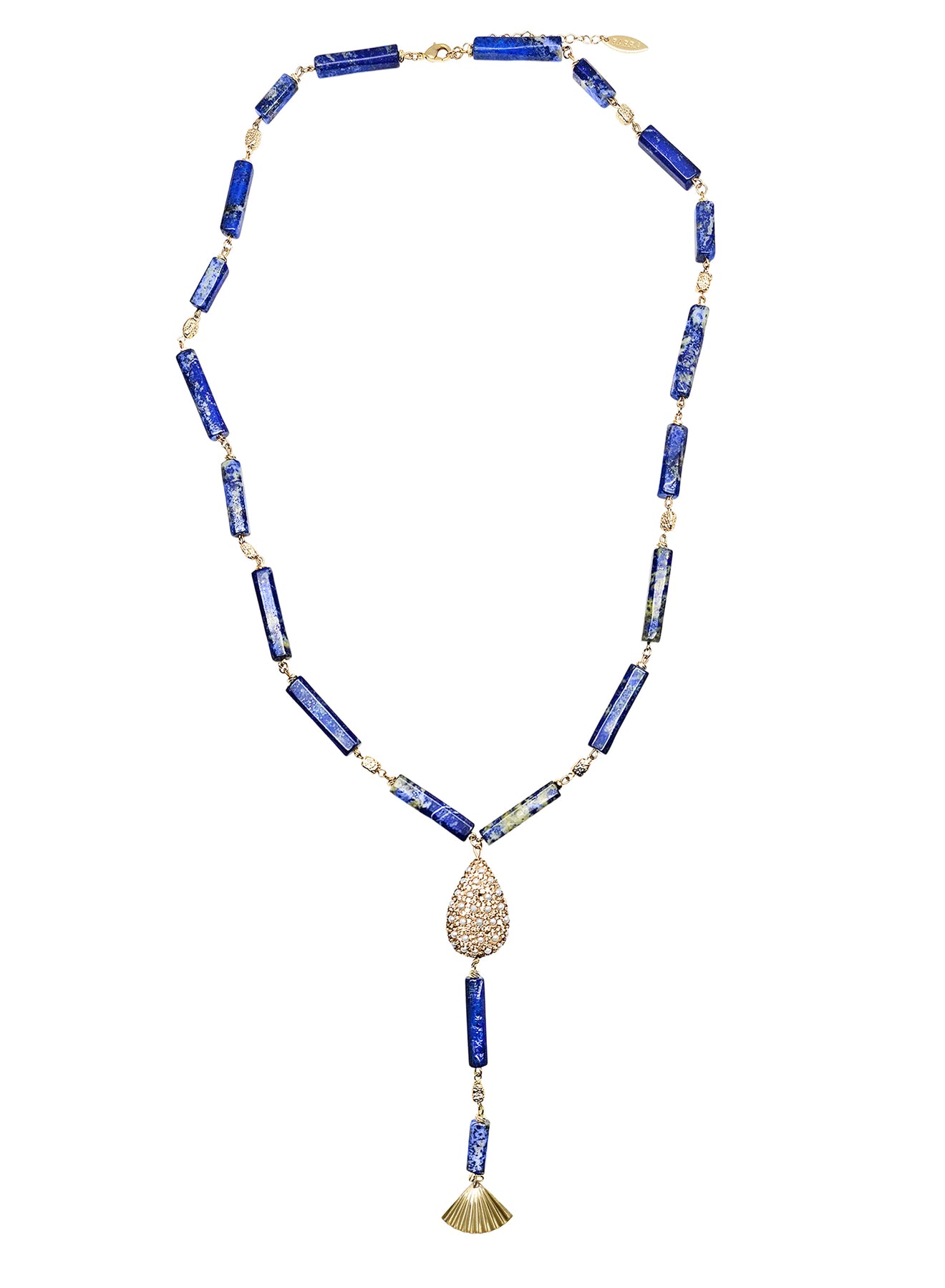 The design features Lapis Lazuli, showcasing the stone's signature deep royal blue with natural flecks of golden pyrite. The necklace converges at a sparkling, pavé-set teardrop connector that leads to a dramatic drop, finishing with a polished gold-tone fan tassel. Lapis Lazuli is celebrated as a stone of wisdom and truth, believed to enhance intellectual ability and encourage honest expression, making this piece a symbol of both beauty and inner strength.