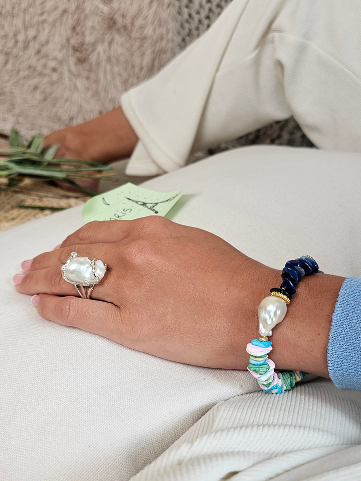This stunning piece features an enchanting combination of rich blue kyanite discs and vibrant colorful shell beads, creating a delightful contrast that captures the eye. The centerpiece, a lustrous baroque pearl, adds a touch of elegance and uniqueness, symbolizing individuality and beauty. Blue kyanite is renowned for its calming properties, promoting emotional balance and tranquility, making this bracelet not just a stylish accessory but also a source of positive energy.