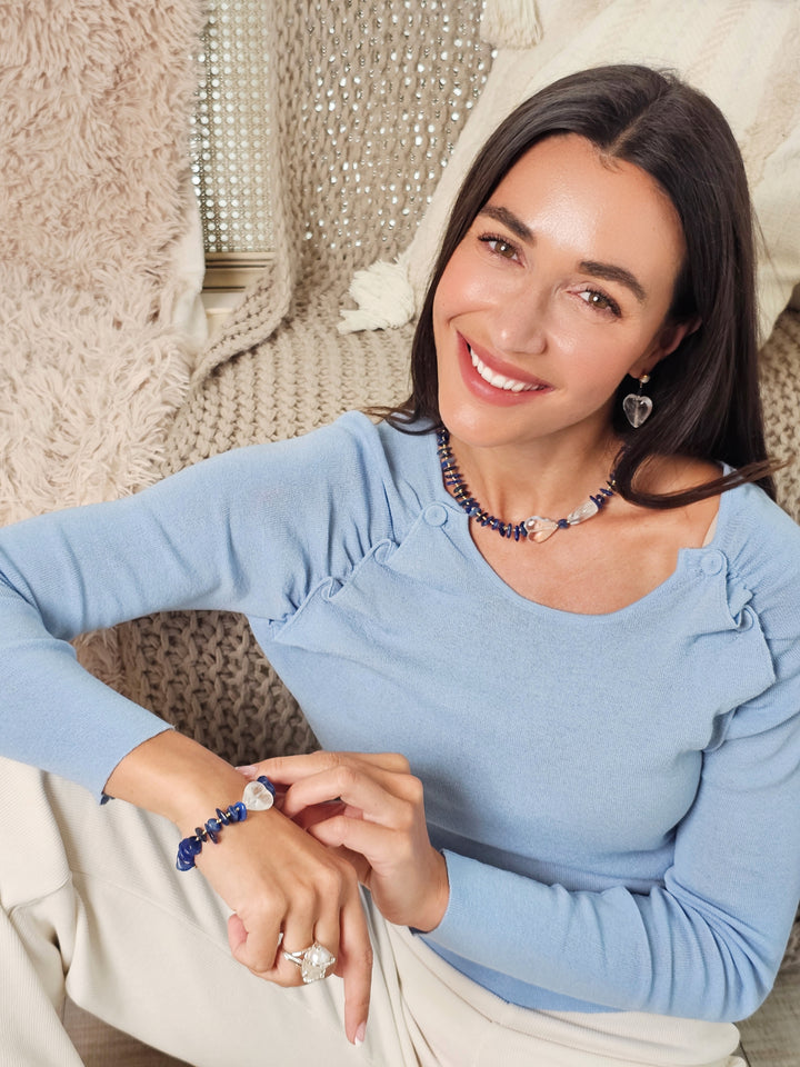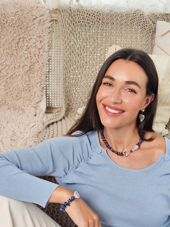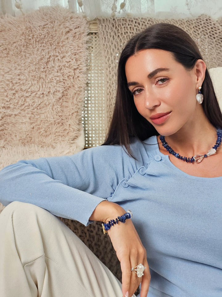 This exquisite piece features a stunning arrangement of deep blue kyanite discs, celebrated for their soothing properties and striking color. The necklace is beautifully accented with a delightful bowknot-shaped white quartz centerpiece, symbolizing love and harmony. Blue kyanite is known for its ability to promote emotional balance, enhance communication, and foster tranquility, while white quartz amplifies energy and clarity, making this necklace not just a fashion statement but also a source of positive energy.