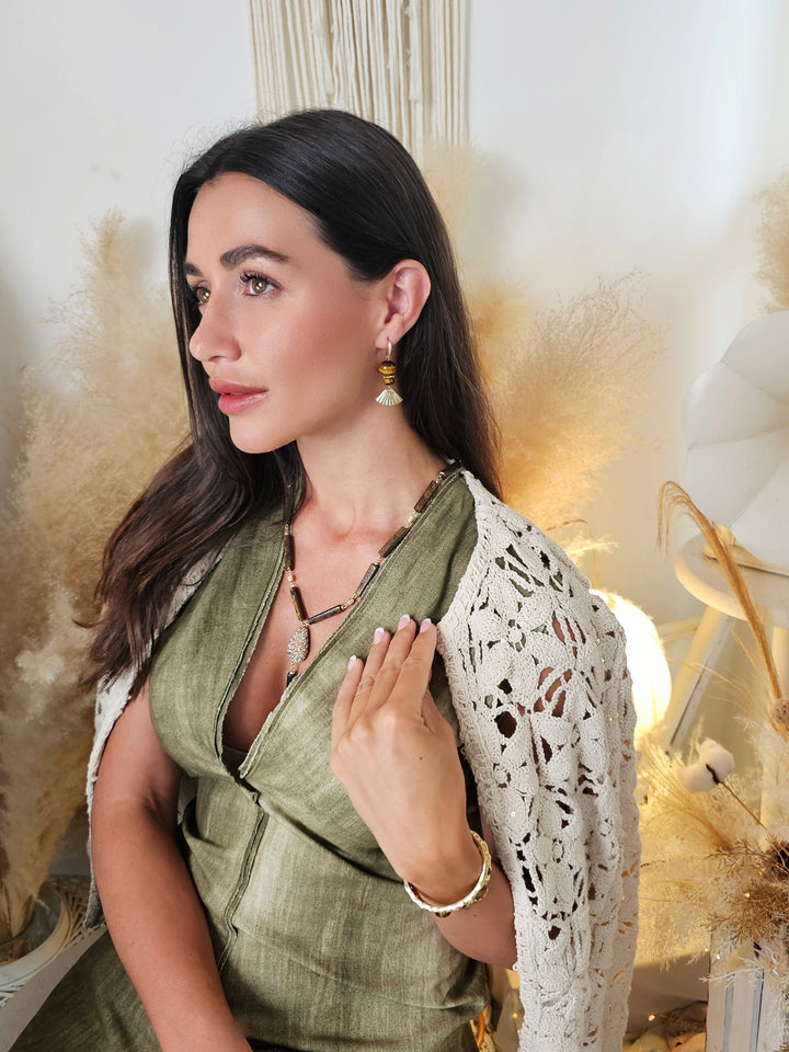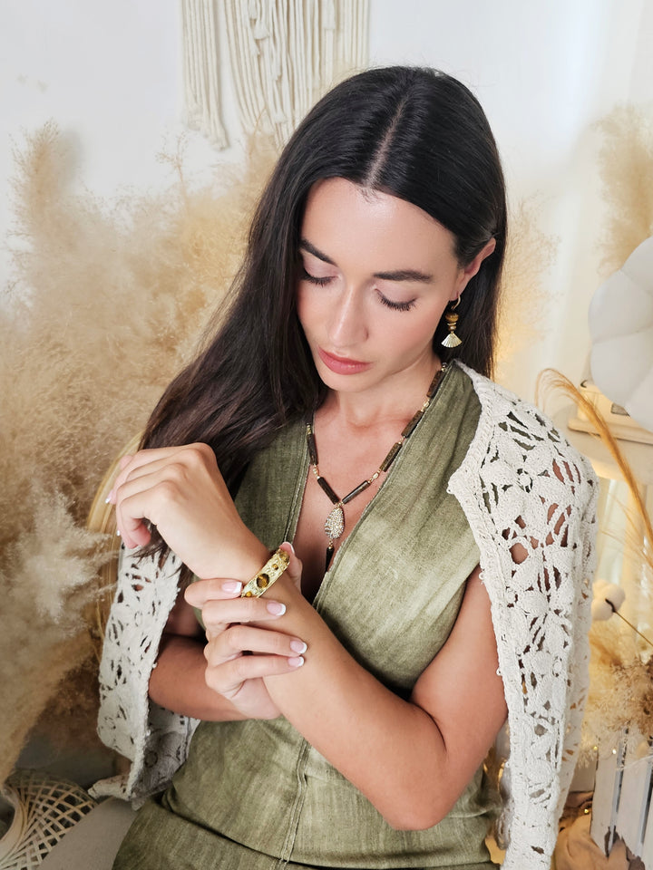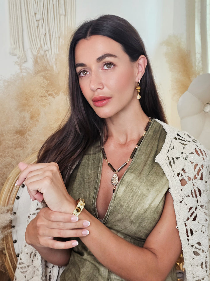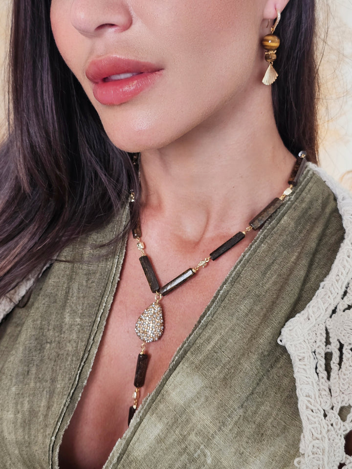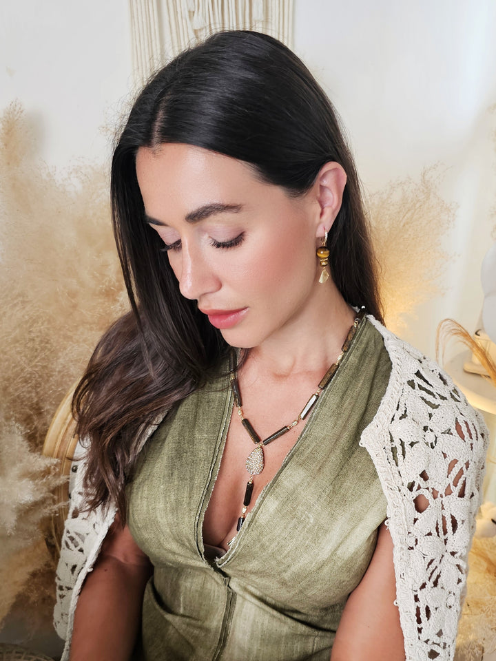 Tiger-eye is a striking gemstone that is often used in jewelry for both its beauty and its believed metaphysical properties. Known for its rich golden-brown hues and unique chatoyancy, tiger-eye is thought to promote clarity and balance in one's life. This stone is often associated with grounding energy, helping to alleviate fears and anxieties while fostering a sense of confidence and stability. Wearing tiger-eye jewelry, such as a Y-shaped necklace, not only enhances one's style but also serves as a reminder of these positive attributes.